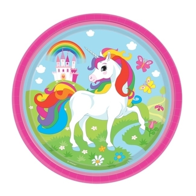 Il s'agit d'un paquet de 8 assiettes en carton laminé avec des bords roses. Elles présentent une licorne blanche sur un fond de belles couleurs et un château. Tout est en harmonie avec les couleurs de l'arc-en-ciel.