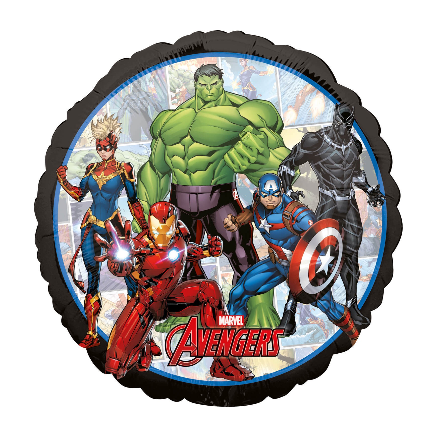 Ballon métallisé officiel Avengers avec un motif tout en couleur mettant en scène Hulk, Iron Man et Captain America.