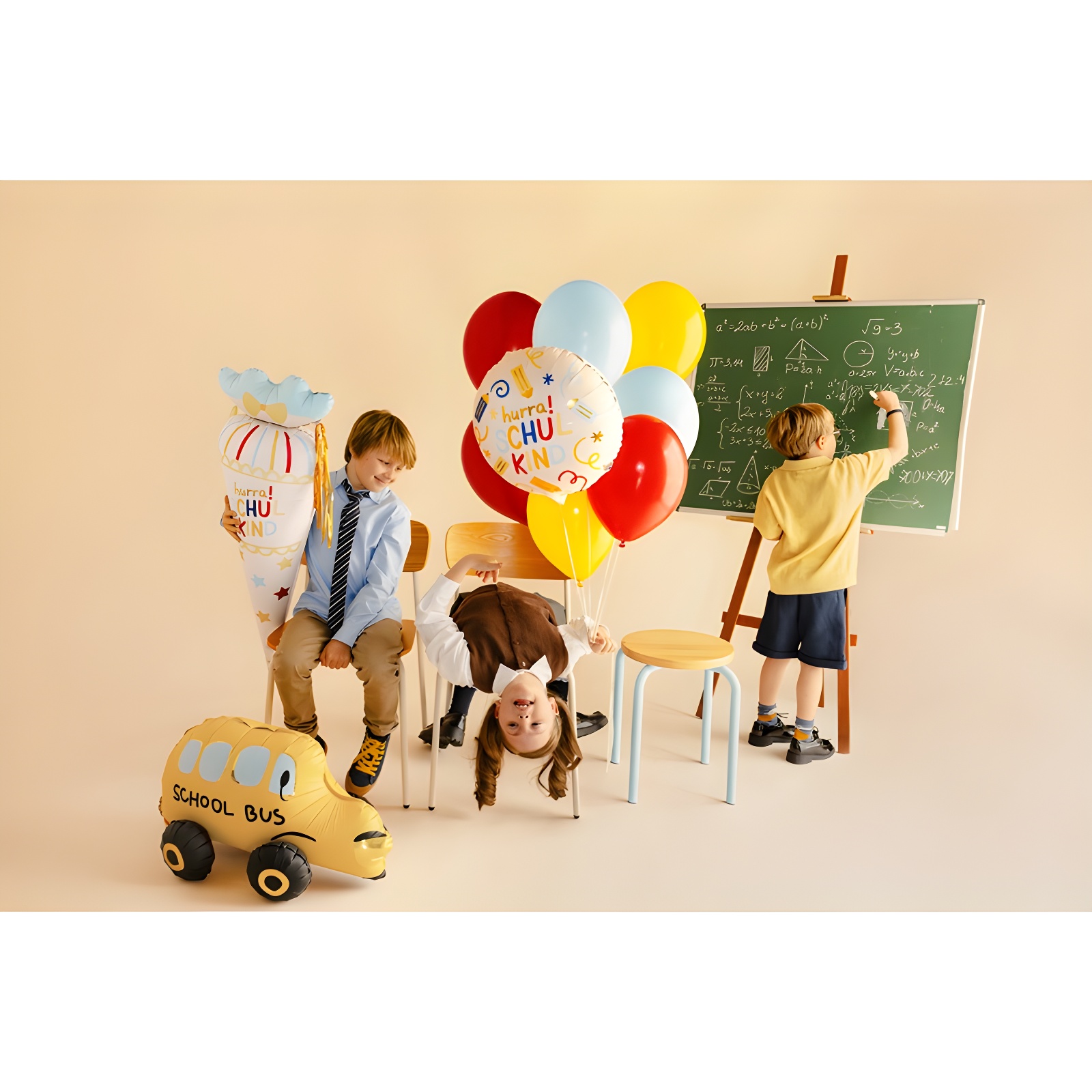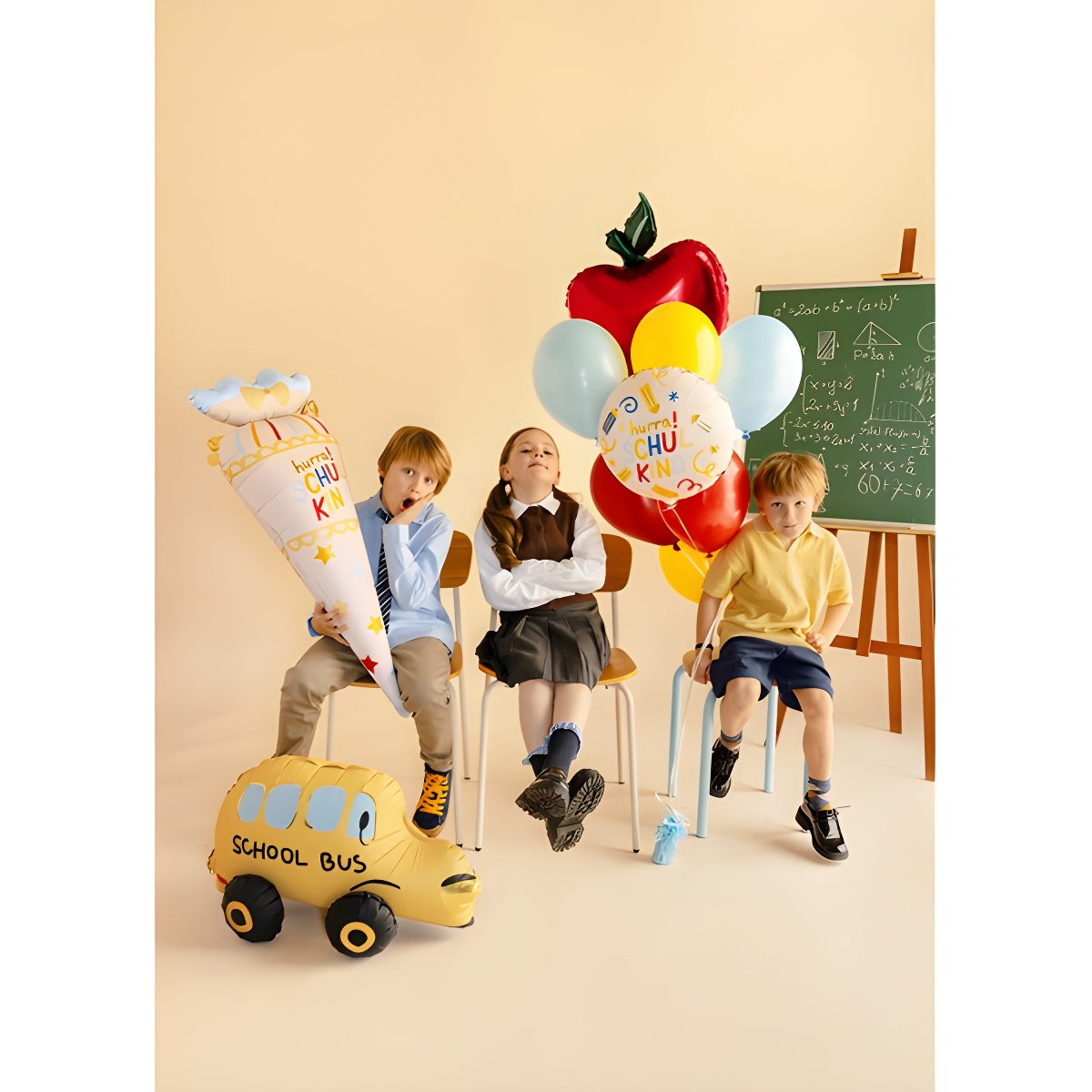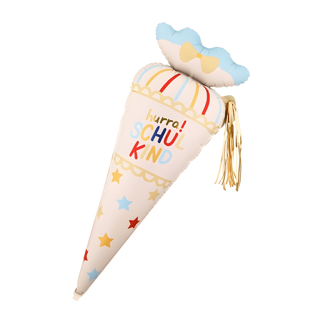 Ballon en foil en forme de cône scolaire avec l'inscription "Hurra Schulkind" couleur crème, décoré d'étoiles et de détails dans des tons pastel et dorés. Mesure 43 x 113 cm avant gonflage (16,9 x 44,5'') et 34,5 x 99 cm après gonflage (13,6 x 39''). Valve auto-obturante pour un gonflage rapide et confortable. Convient pour l'hélium et pour un gonflage à l'air ; il dispose de crochets intégrés et d'un pompon décoratif pour l'intégrer à vos compositions ou le suspendre au mur. Le set comprend une paille pour le gonflage.