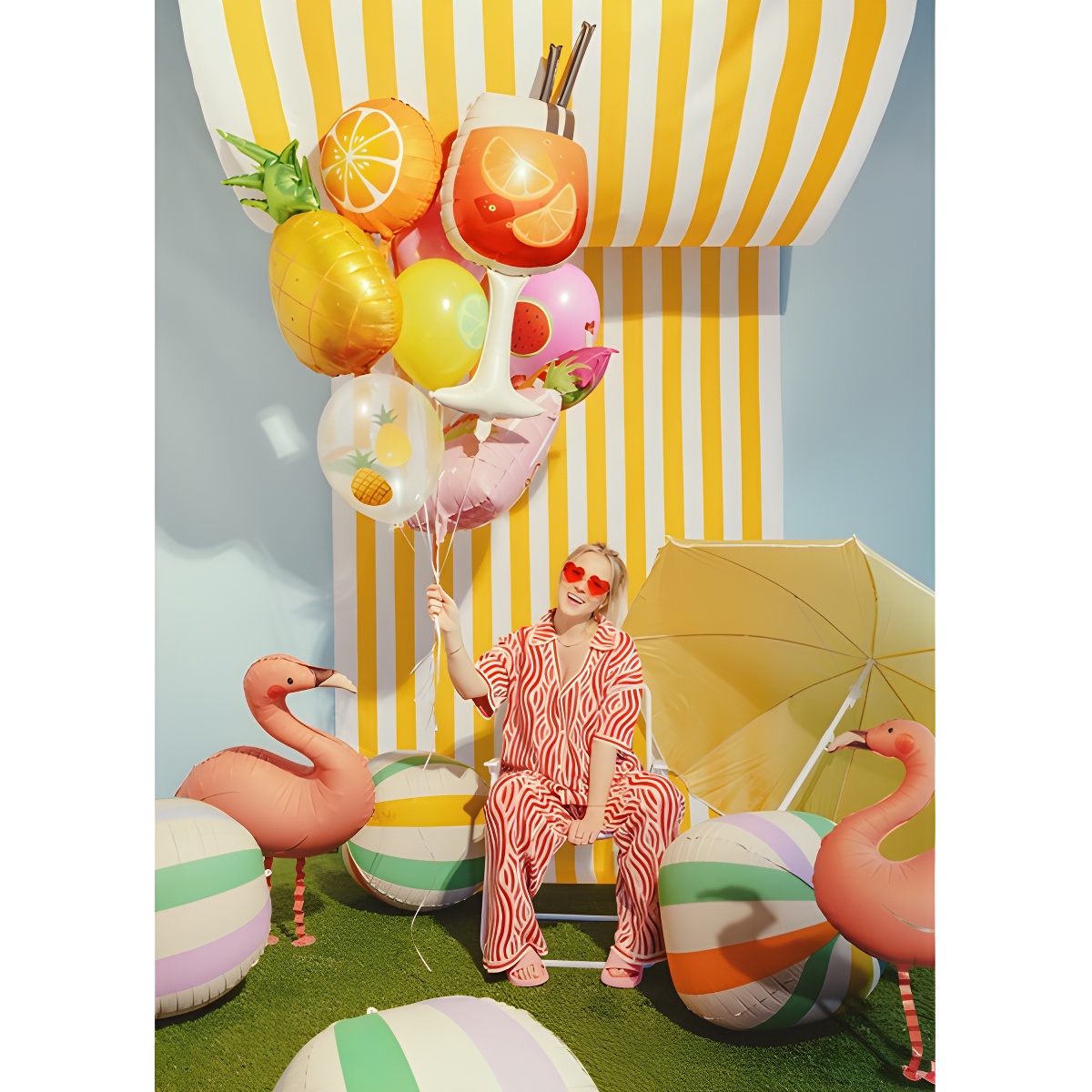 Ballon foil en forme de coupe cocktail au design estival, en tons orange et noir, orné de quartiers d'orange. Il apporte une touche gaie et visuelle aux tables, photocalls et espaces bar, pour créer une ambiance idéale lors de vos fêtes estivales.