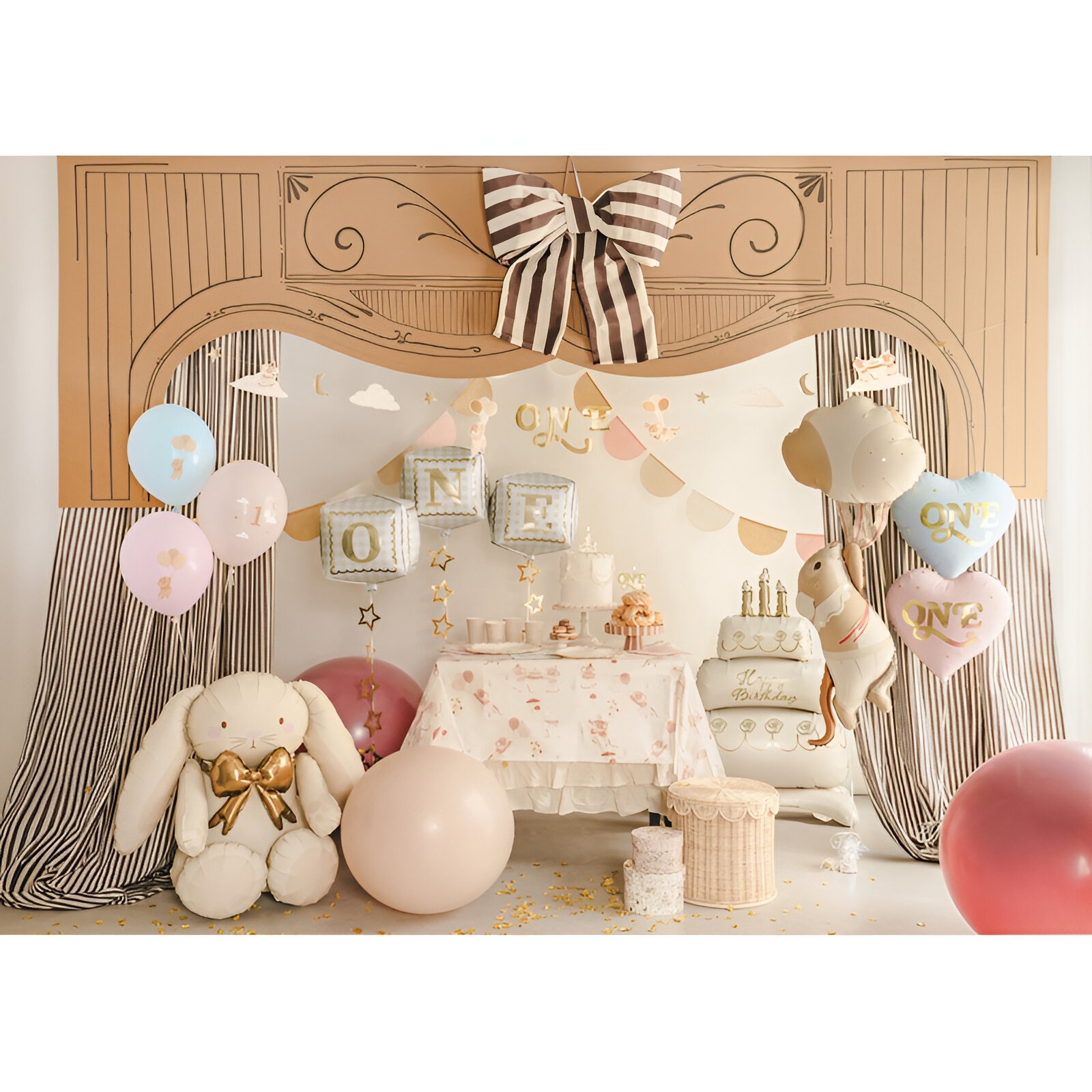 Foil Balloon Bunny dans des tons crème et rose pâle, orné d'un noeud doré, conçu pour apporter une touche tendre et élégante à vos baby showers et baptêmes. Avant gonflage, il mesure environ 104,5 x 99 cm ; une fois gonflé, il atteint environ 74 x 84 cm. Prévu pour un gonflage à l'air, il vous offre une silhouette définie et une finition brillante qui se démarque dans n'importe quel montage.