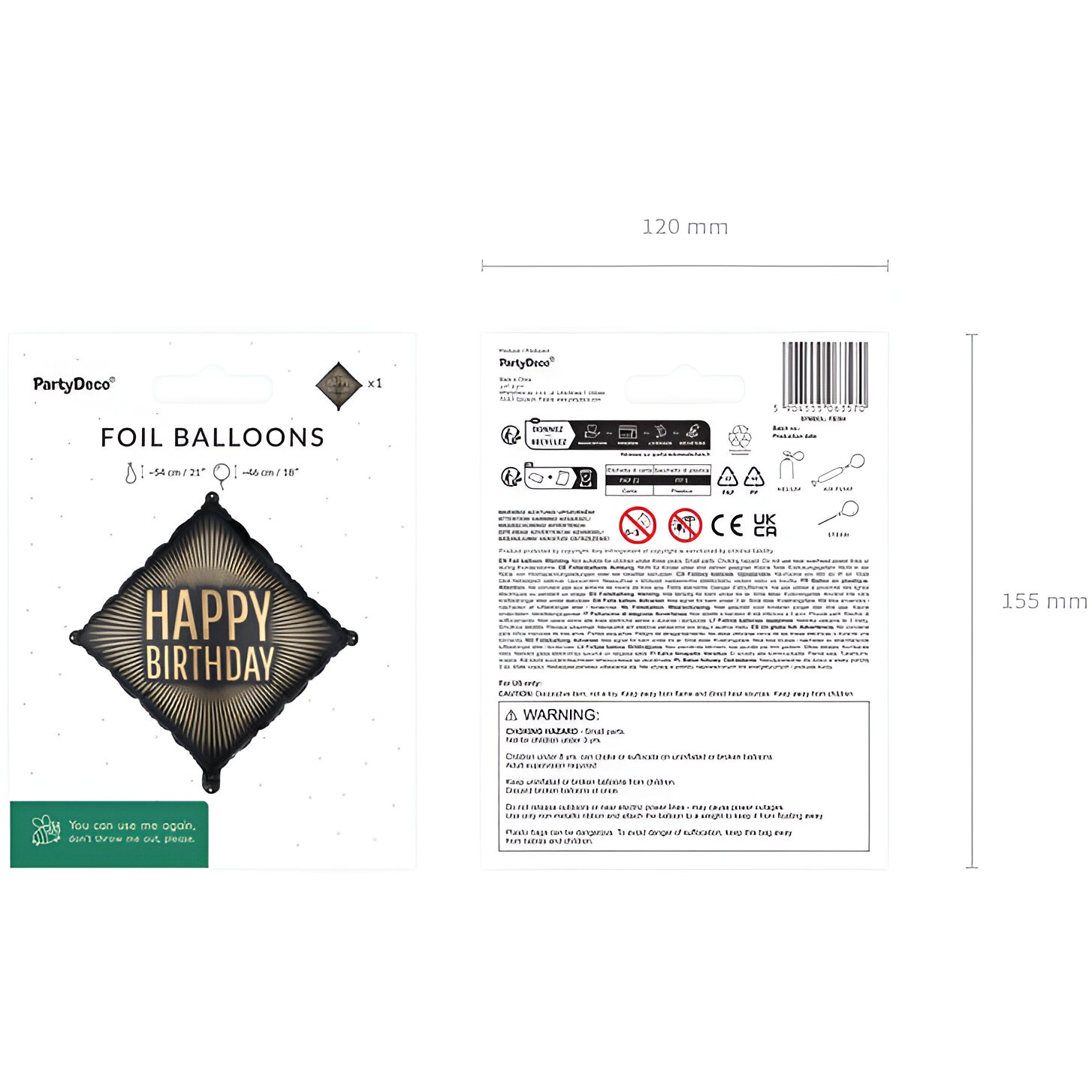• Design élégant en noir et doré avec l'inscription visible « Happy Birthday ».
