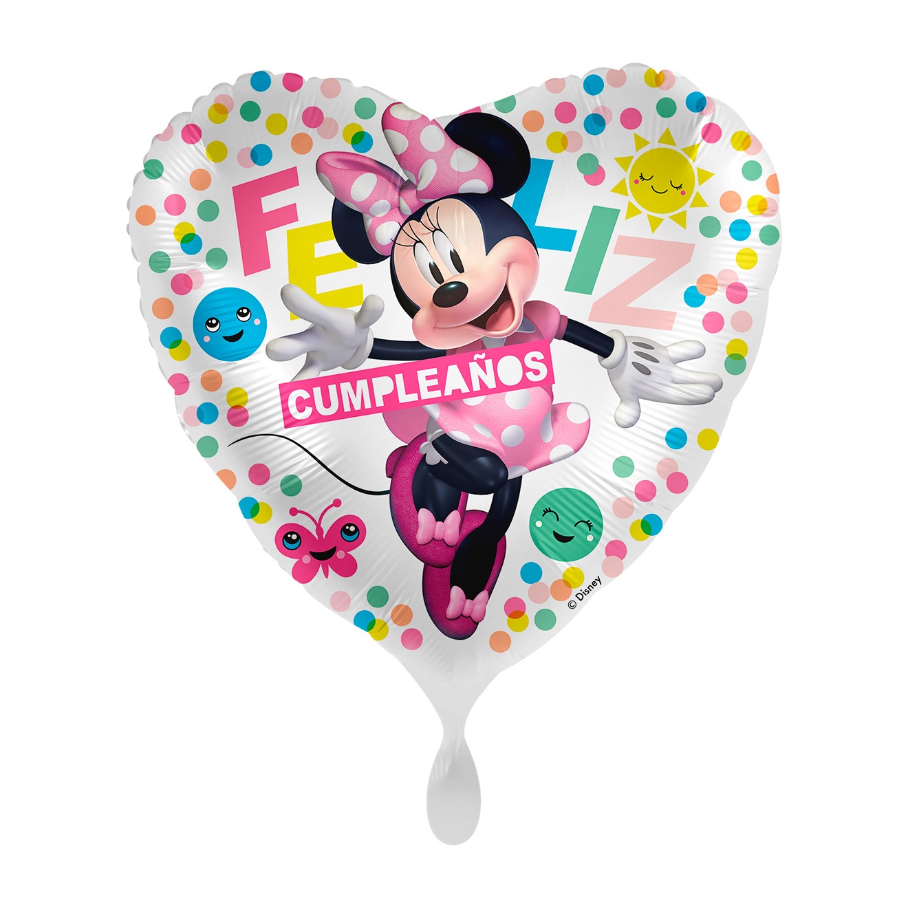 Ballon en foil à l'effigie de Minnie Mouse avec l'inscription "Feliz Cumpleaños" dans un design coeur attractif.
