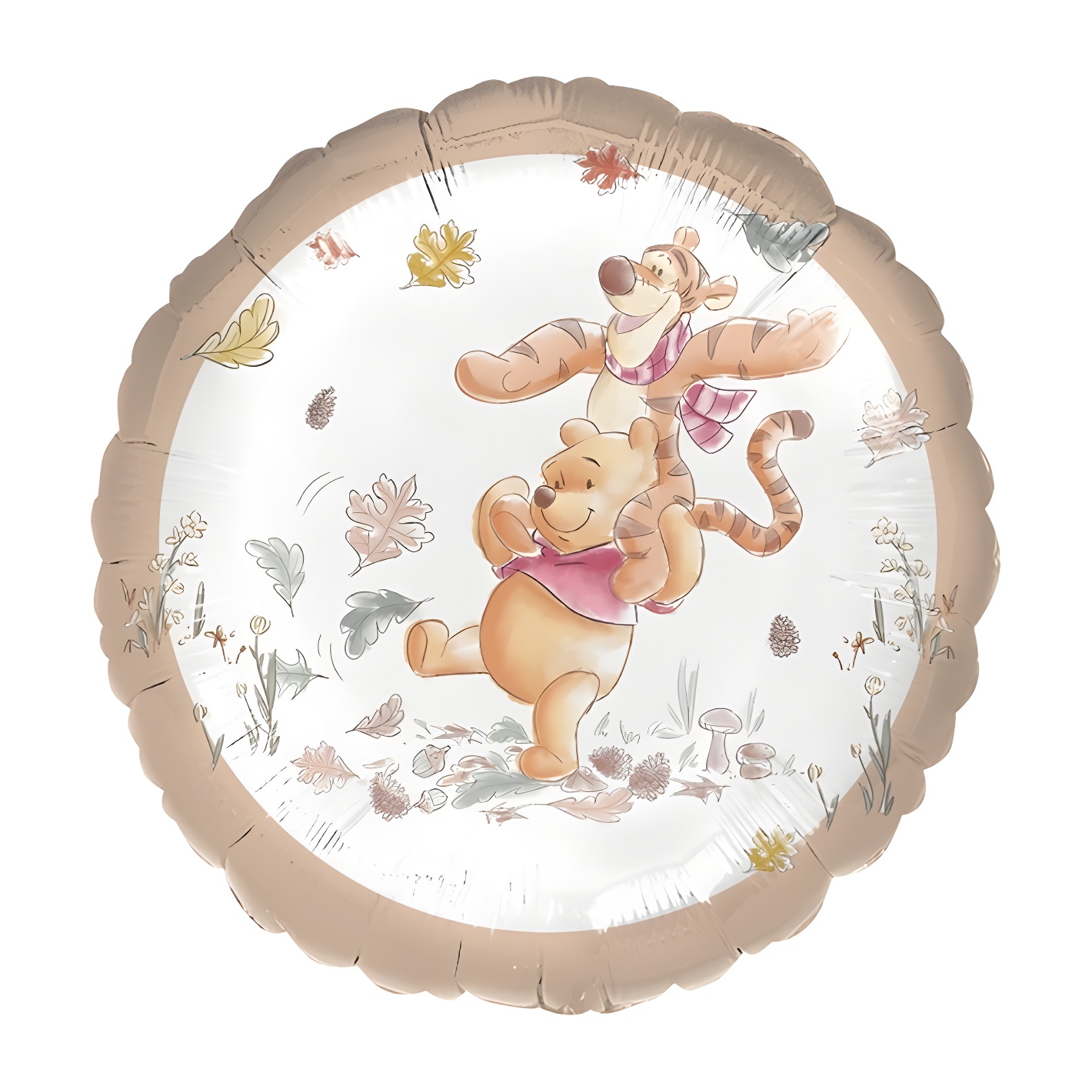 Ballon foil au design officiel Disney mettant en scène Winnie l'Ourson et Tigrou, avec des illustrations aux tons doux et des éléments d'inspiration automnale qui apportent une atmosphère tendre et joyeuse à toute fête enfantine.