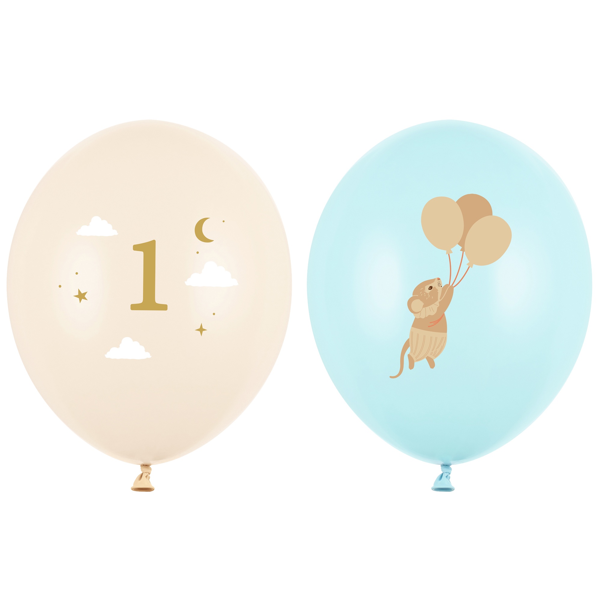 Ces ballons décoratifs au motif tendre de souris et au chiffre 1 sont conçus pour mettre en valeur le premier anniversaire de votre enfant. Ils bénéficient d'une impression recto-verso afin que le motif soit visible quel que soit l'angle. Les tons pastel apportent une atmosphère douce et élégante, parfaitement adaptée aux décorations infantiles et aux thèmes neutres. Diamètre approximatif de 30 cm une fois gonflés ; présentation en lot de grande quantité pour décorer facilement.