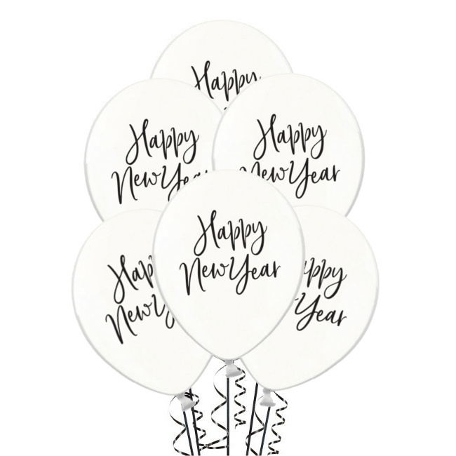 Lot de ballons transparents avec les lettres "Happy New Year" en noir, idéaux pour décorer votre fête du Nouvel An.