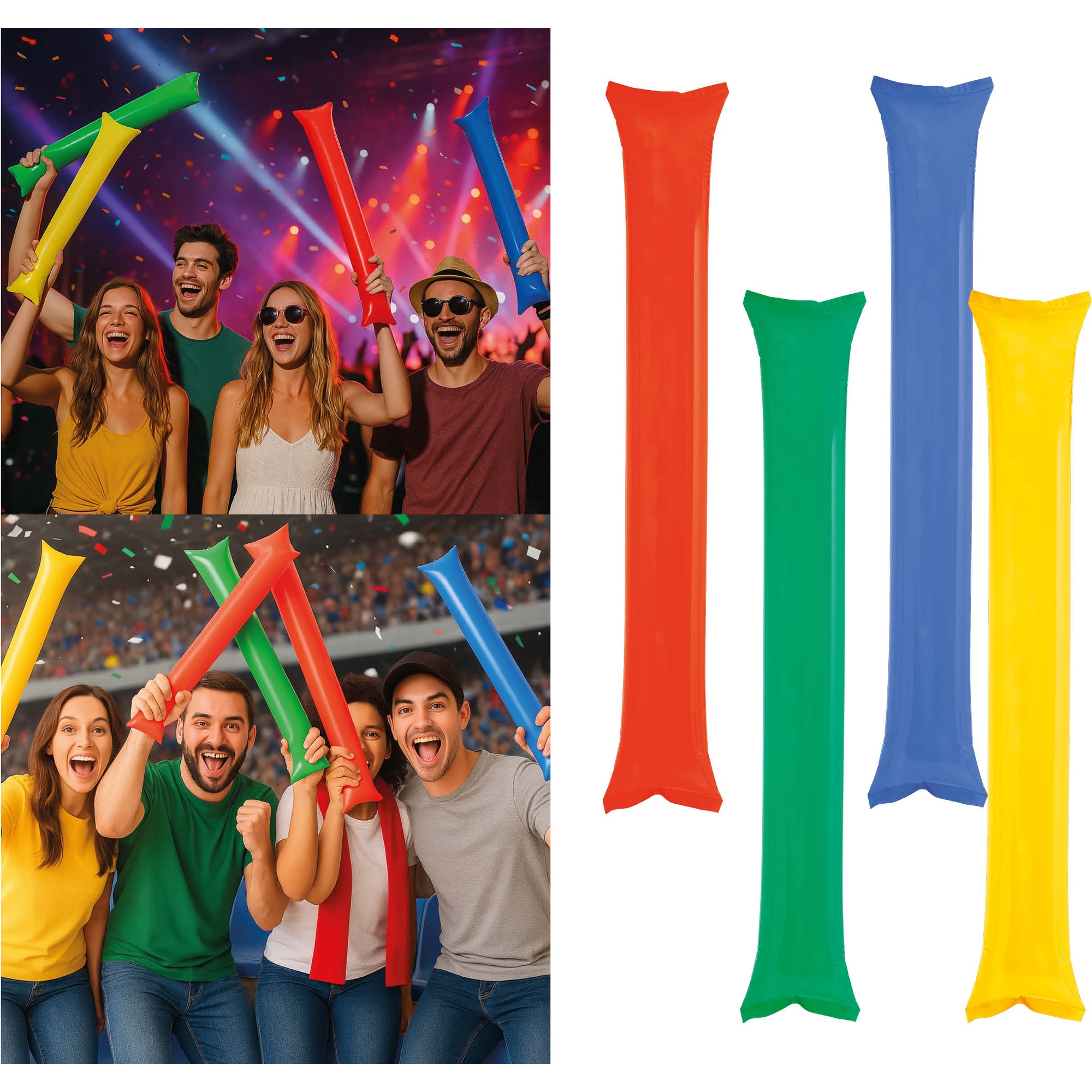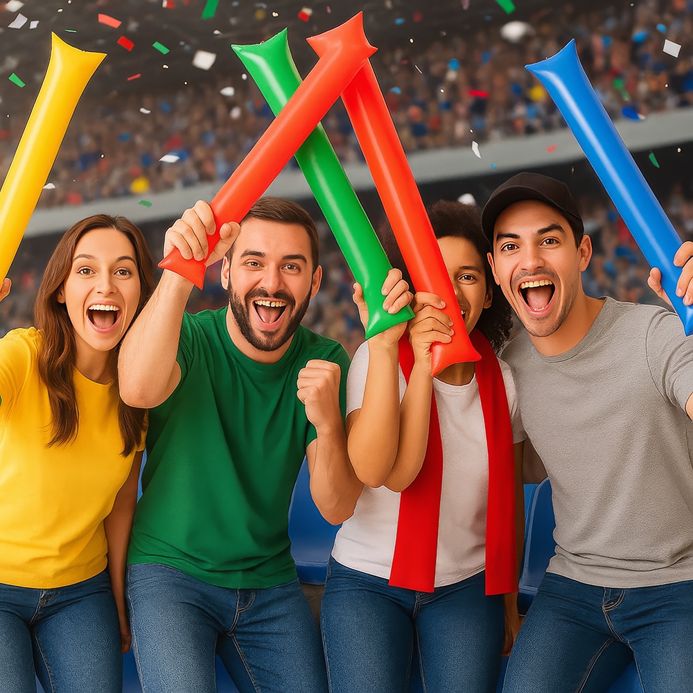Donnez de l'ambiance à vos matchs et à vos célébrations avec ces bâtons gonflables aux couleurs assorties. Pensés pour créer de l'ambiance et produire un son saisissant au contact, ils conviennent parfaitement aux stades, aux groupes de supporters, aux concerts et aux fêtes. Ils se gonflent en un instant, sont légers à transporter et faciles à utiliser tout au long de l'événement. Couleurs éclatantes et matériau robuste pour animer en groupe en toute sérénité.