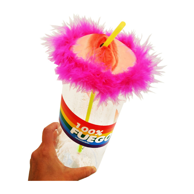 Ce biberon se compose d'une bouteille transparente avec une paille rose sur le dessus et une décoration de vagin sur une zone velue en rose.