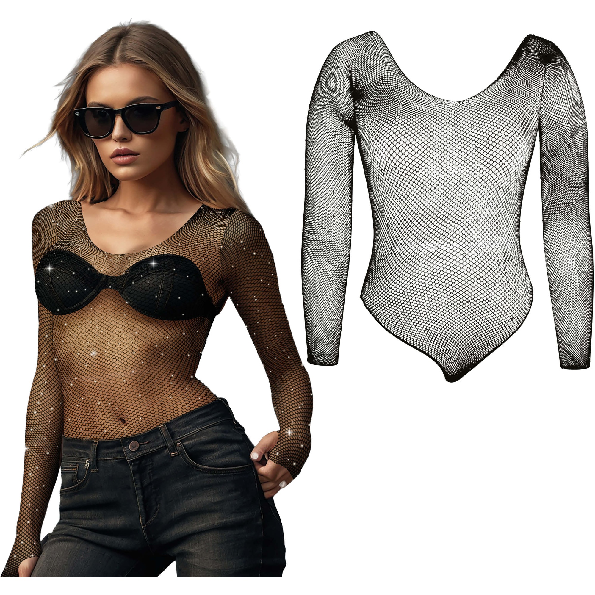 Body noir en maille orné de strass, conçu pour vos looks de soirée et l'ambiance club. Sa coupe ajustée et ses manches longues offrent une silhouette sophistiquée et sensuelle, avec une transparence maîtrisée qui met en valeur chaque tenue. Parfait pour que vous le portiez sur une bralette, un top ou avec des jeans, jupes ou shorts afin de créer des styles audacieux et modernes. Confectionné en élasthanne et polyamide pour vous garantir un ajustement confortable et flexible qui épouse le corps.