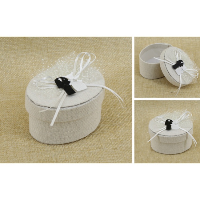 Cette boîte de couleur beige est recouverte de toile de jute. Elle se distingue par la présence d’un couvercle pratique, qui comporte également une belle décoration avec costumes de marié et robe de mariée, dotée d’un noeud de rubans blancs.