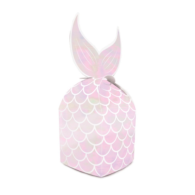 Ensemble de 8 petites boîtes en carton, de couleur rose iridescente, qui simulent les écailles d'une sirène, surmontées de la queue de celle-ci.
