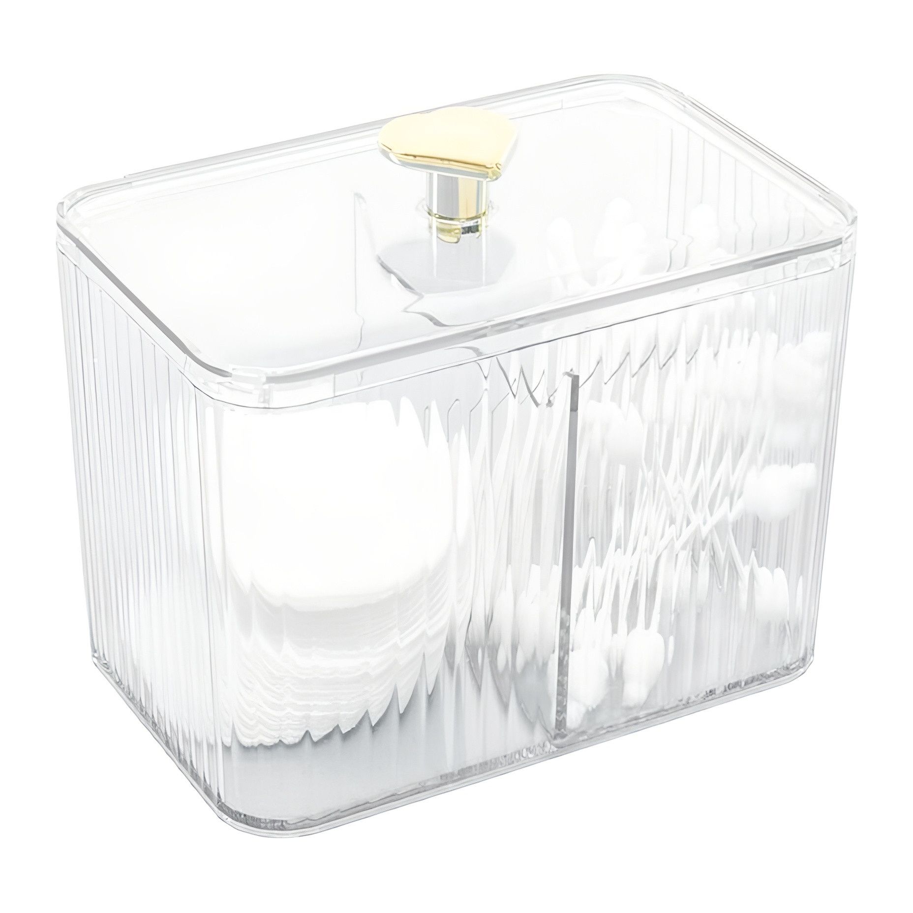 Organisez vos cotons et cotons?tiges avec style grâce à cette boîte à deux compartiments. Sa conception transparente permet d'identifier le contenu d'un coup d'oeil, tandis que le couvercle orné d'un bouton apporte une touche raffinée. Compacte et fonctionnelle, elle offre une solution pratique pour maintenir l'ordre sur votre coiffeuse ou vos étagères, en s'intégrant facilement à toute décoration.