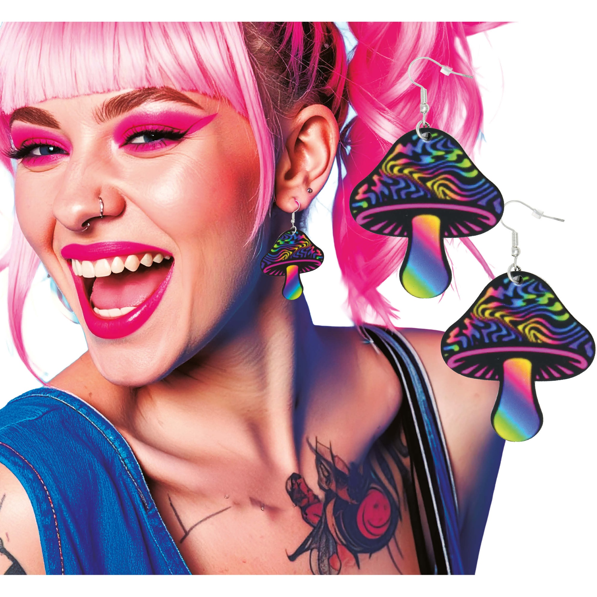 Ces boucles d'oreilles en forme de champignon, aux couleurs psychédéliques, sont conçues pour apporter une note audacieuse et alternative à votre style. Fabriquées en métal et PVC, elles allient solidité et légèreté pour un port confortable. Le motif saisissant et les tons néon font de ces boucles une pièce maîtresse des looks d'inspiration alternative et festive. Leur attache à crochet classique facilite la mise en place.