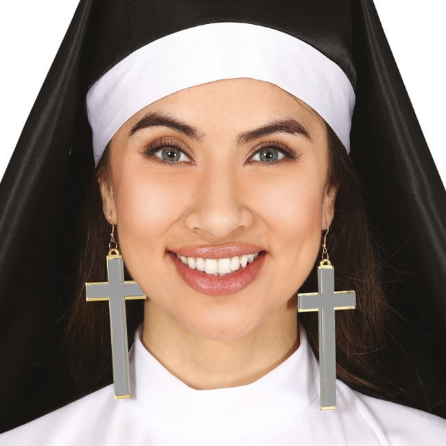 Boucles d'oreilles composées d'une croix de couleur grise avec un bord doré, idéales pour vos déguisements religieux tels que de nonne ou prêtresse. Vous pourrez les porter aussi bien au Carnaval qu'à Halloween, en apportant un aspect terrifiant au déguisement avec un maquillage effrayant.