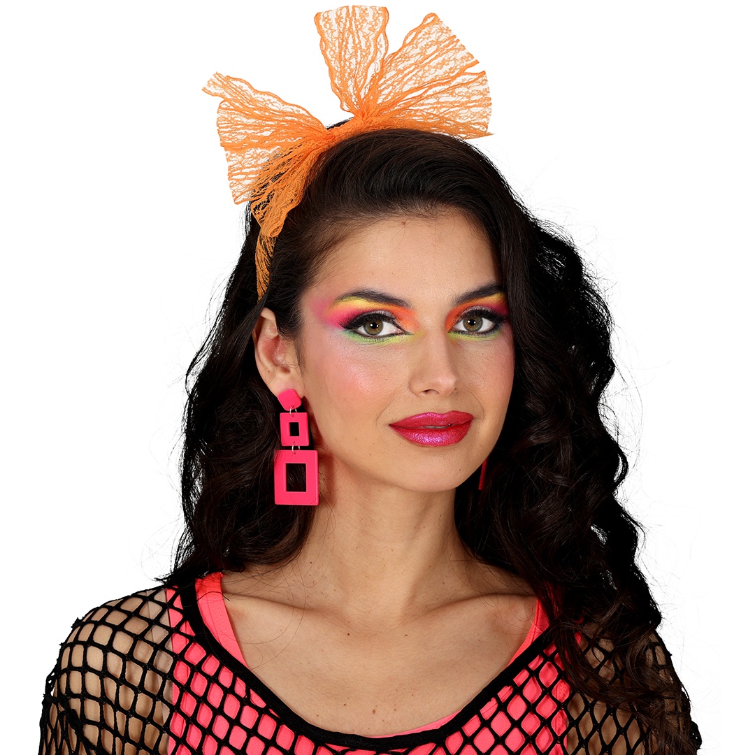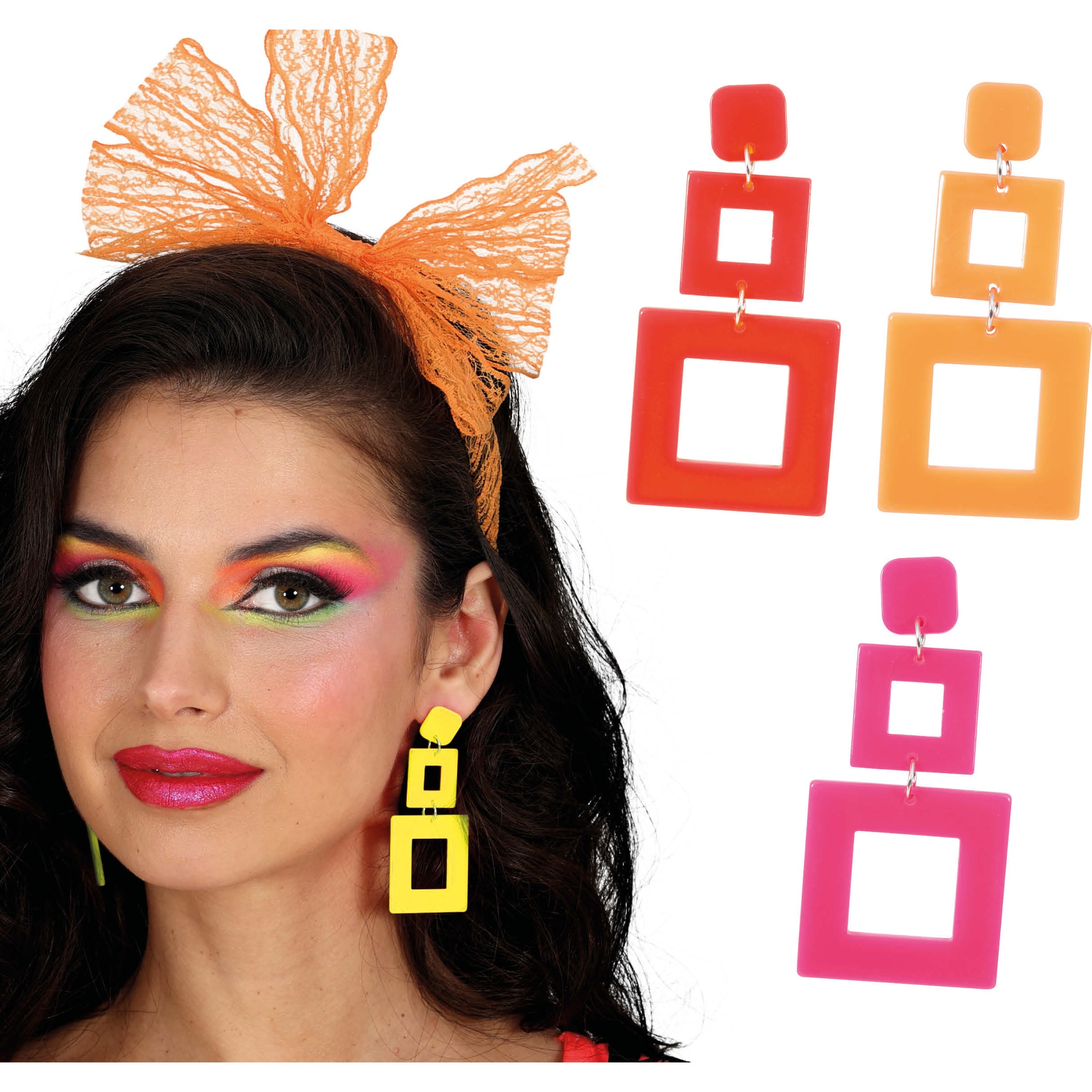 Boucles d'oreilles inspirées des années 80 au design géométrique et aux couleurs néon, pour une allure rétro et très visible. Parfaites pour compléter déguisements, looks années 80 et soirées à thème. Légères et d'un fort impact visuel, elles sont idéales pour le carnaval, les photocalls et tout événement où vous souhaitez vous démarquer. Associez-les à un maquillage et des accessoires colorés pour un ensemble authentique et amusant.