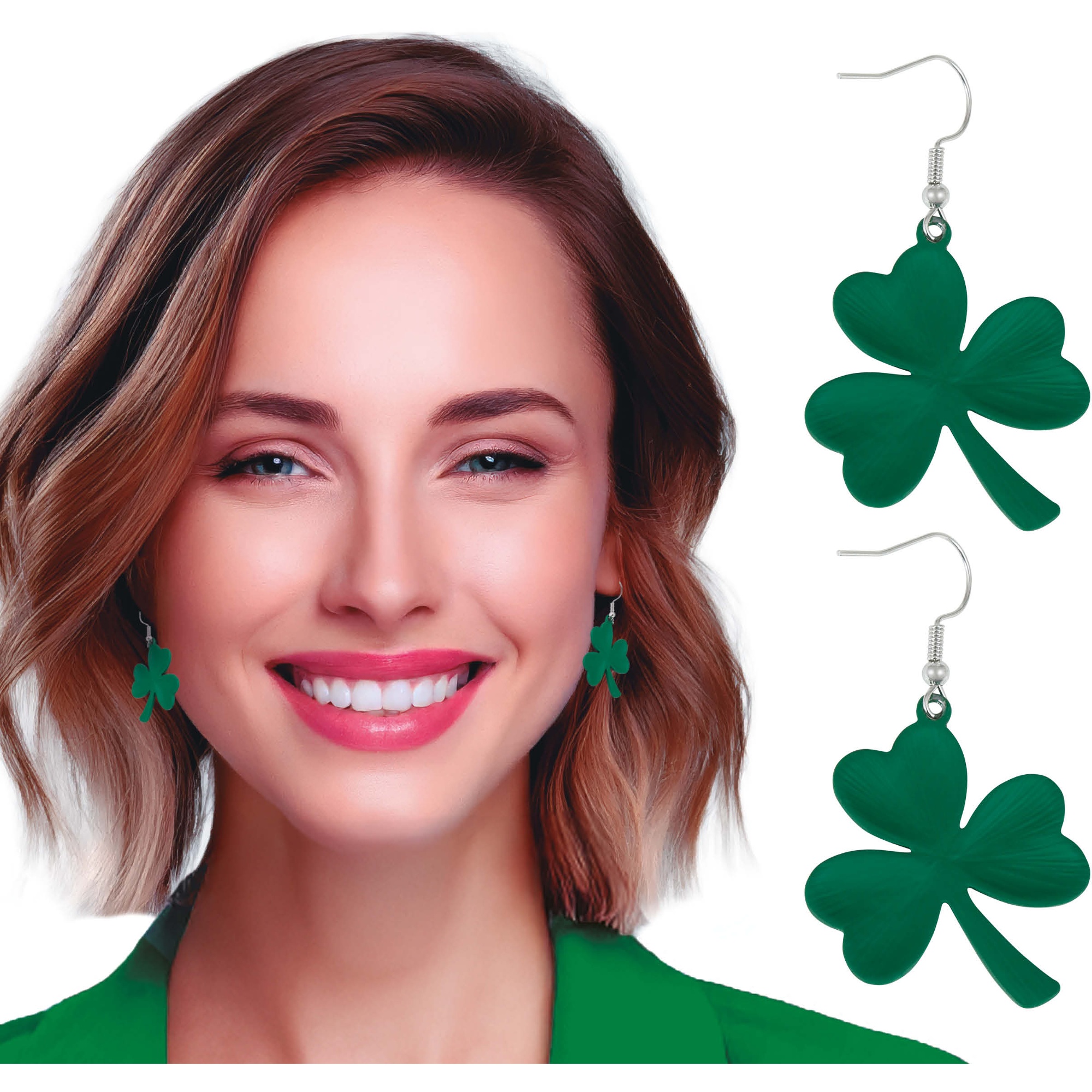Boucles d'oreilles trèfle Saint-Patrick - parfaites pour compléter votre tenue lors de la Saint-Patrick et autres célébrations thématiques. Design trèfle vert apportant une touche joyeuse et festive. Fabriquées en PVC et montées sur un crochet type « fishhook », elles sont légères et agréables à porter toute la soirée. Idéales comme détail pour événements et photocalls ou comme cadeau original pour vos amies et vos proches. Livrées par paire.
