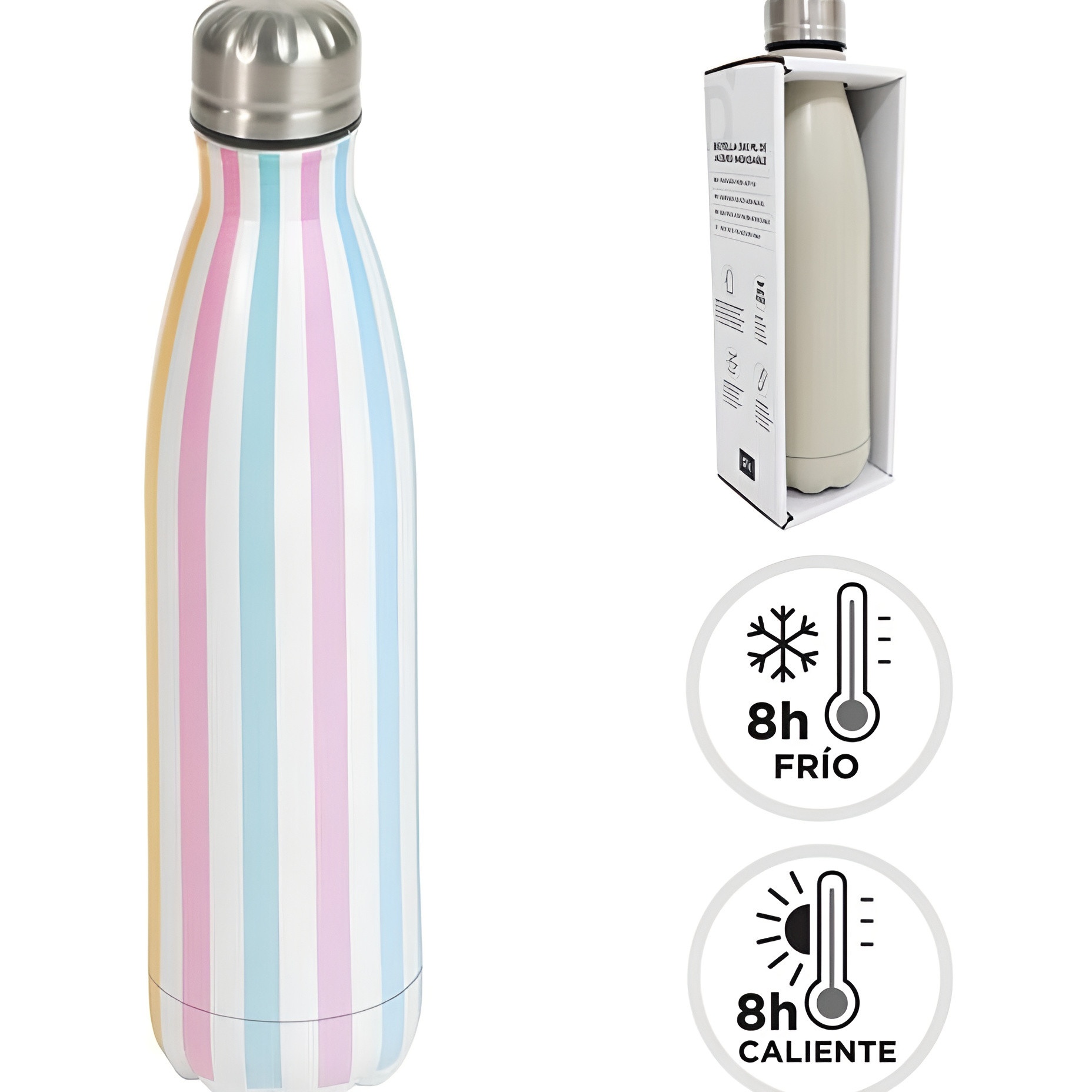Bouteille isotherme au motif à rayures pastel qui apporte couleur et style à votre quotidien.