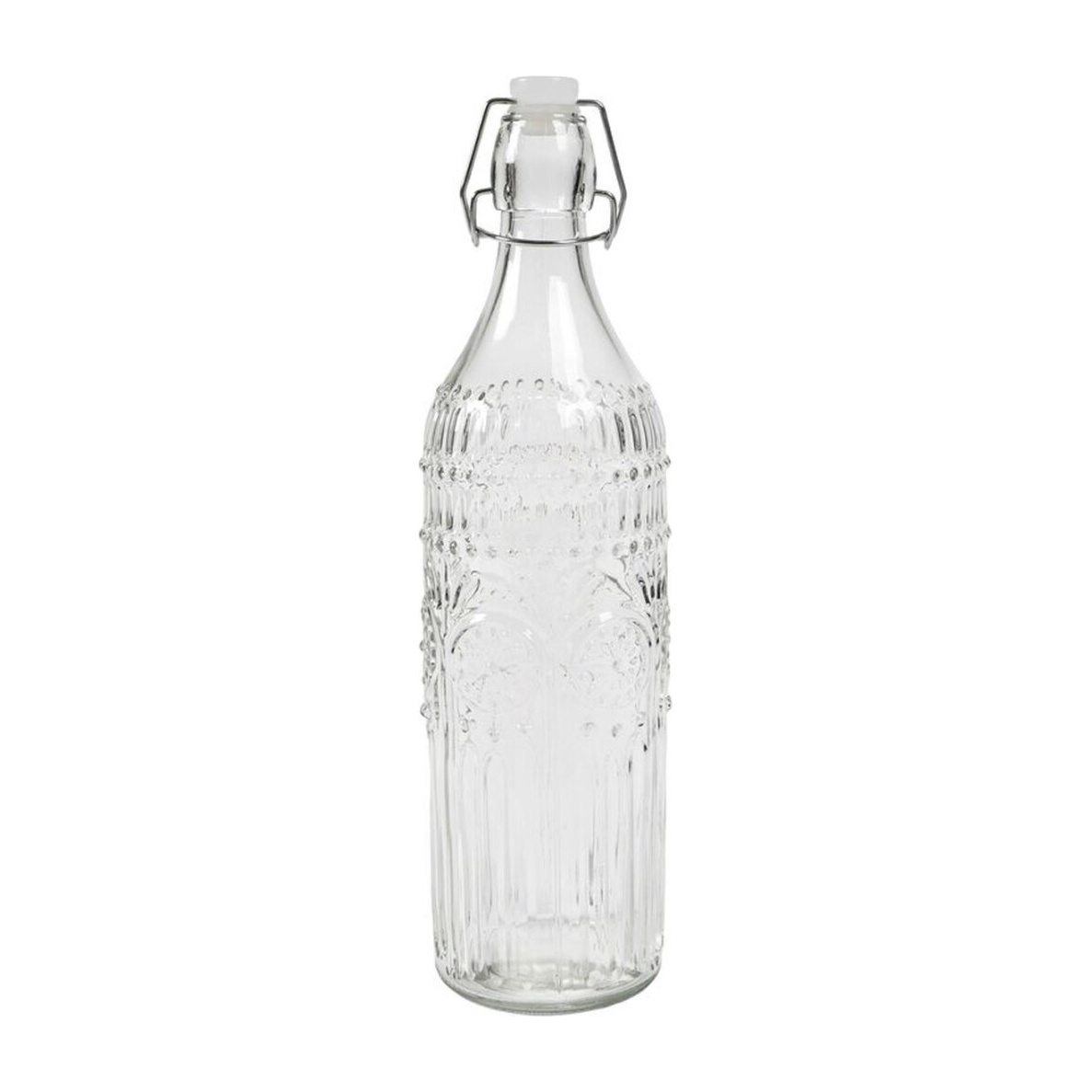 Élégante bouteille au design vintage, dotée d'un relief gravé qui apporte caractère et style à toute table ou à n'importe quel coin de la maison. Sa fermeture hermétique à clip garantit une fermeture sûre et prévient les déversements. D'une capacité d'environ 1 L, elle est à la fois pratique et décorative - parfaite pour conserver vos boissons, huiles ou vinaigres et pour les présenter lors d'événements et réceptions.
