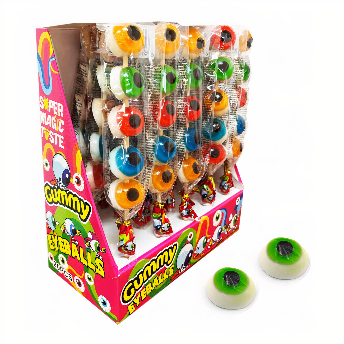 - Chaque brochette contient 5 yeux gélifiés de couleurs assorties.