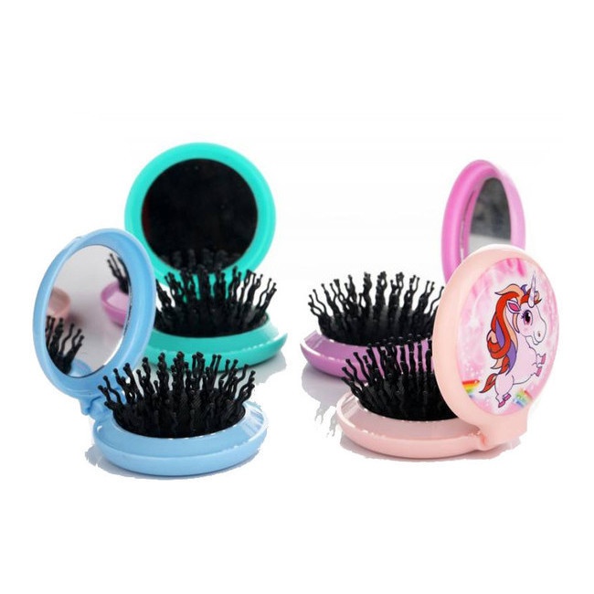 Une brosse avec miroir sur le thème de la licorne avec 4 modèles assortis, idéale comme cadeau. Elle a la taille parfaite pour être portée dans votre sac.
