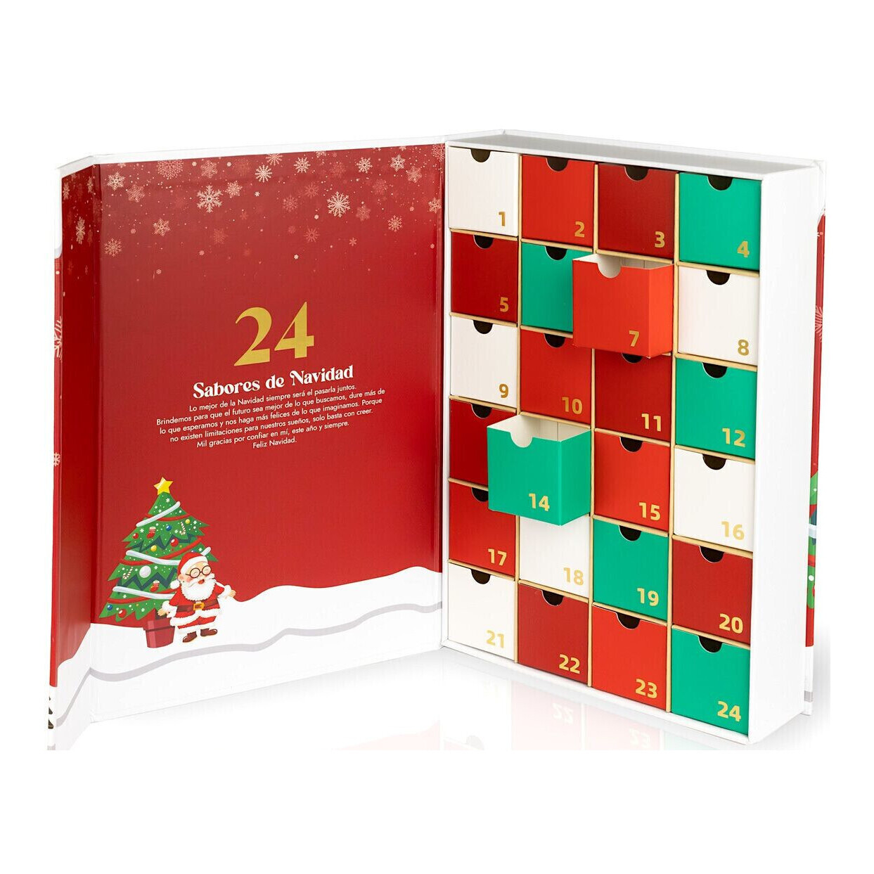 • Le message situé sur le rabat intérieur est: 24 saveurs de Noël. "Le meilleur de Noël, c'est toujours de le passer ensemble. Espérons que l'avenir soit meilleur que ce que nous cherchons, qu'il dure plus longtemps que nous l'espérons et qu'il nous rende plus heureux que nous ne l'imaginons. Il n'y a pas de limites à nos rêves, il suffit de croire. Mille mercis de me faire confiance, cette année et toujours. Joyeux Noël."