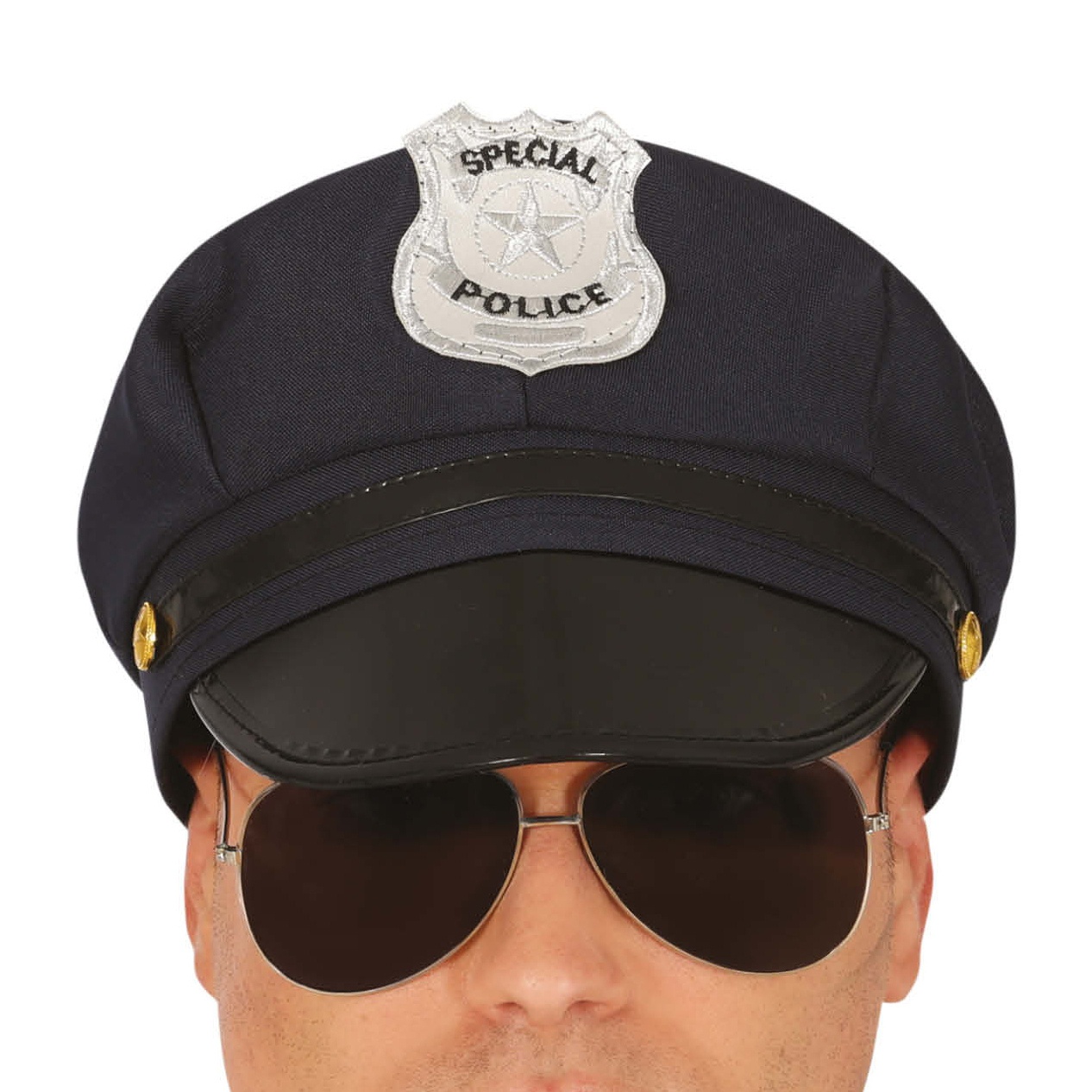 Casquette de policier de couleur bleu marine avec une visière noire et un insigne en tissu cousu à l'avant.