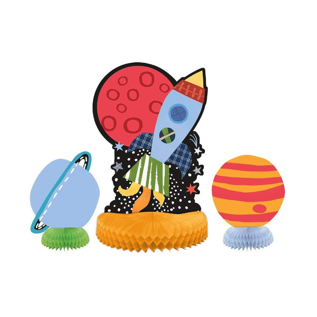 Centre de table composé d'une grande pièce centrale et de 2 pièces moyennes en forme de planètes et de fusées.