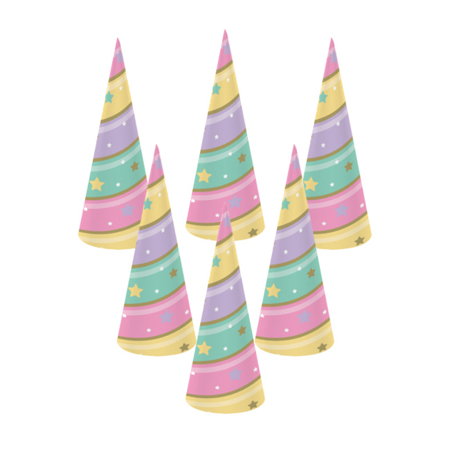 Sac contenant 8 petits chapeaux en carton en forme de cône qui simulent également la corne d'une licorne.