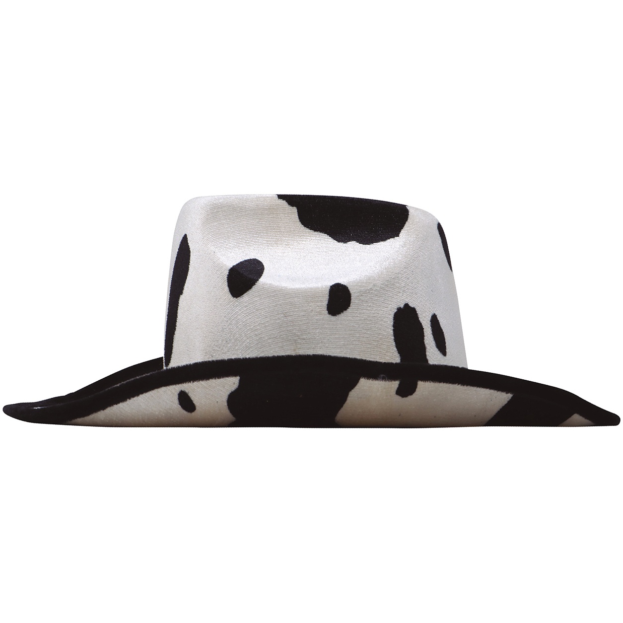 Il s'agit d'un chapeau rigide de couleur blanche avec des taches brunes comme celles des vaches. Il est équipé d'un cordon pour être fixé sous le menton.