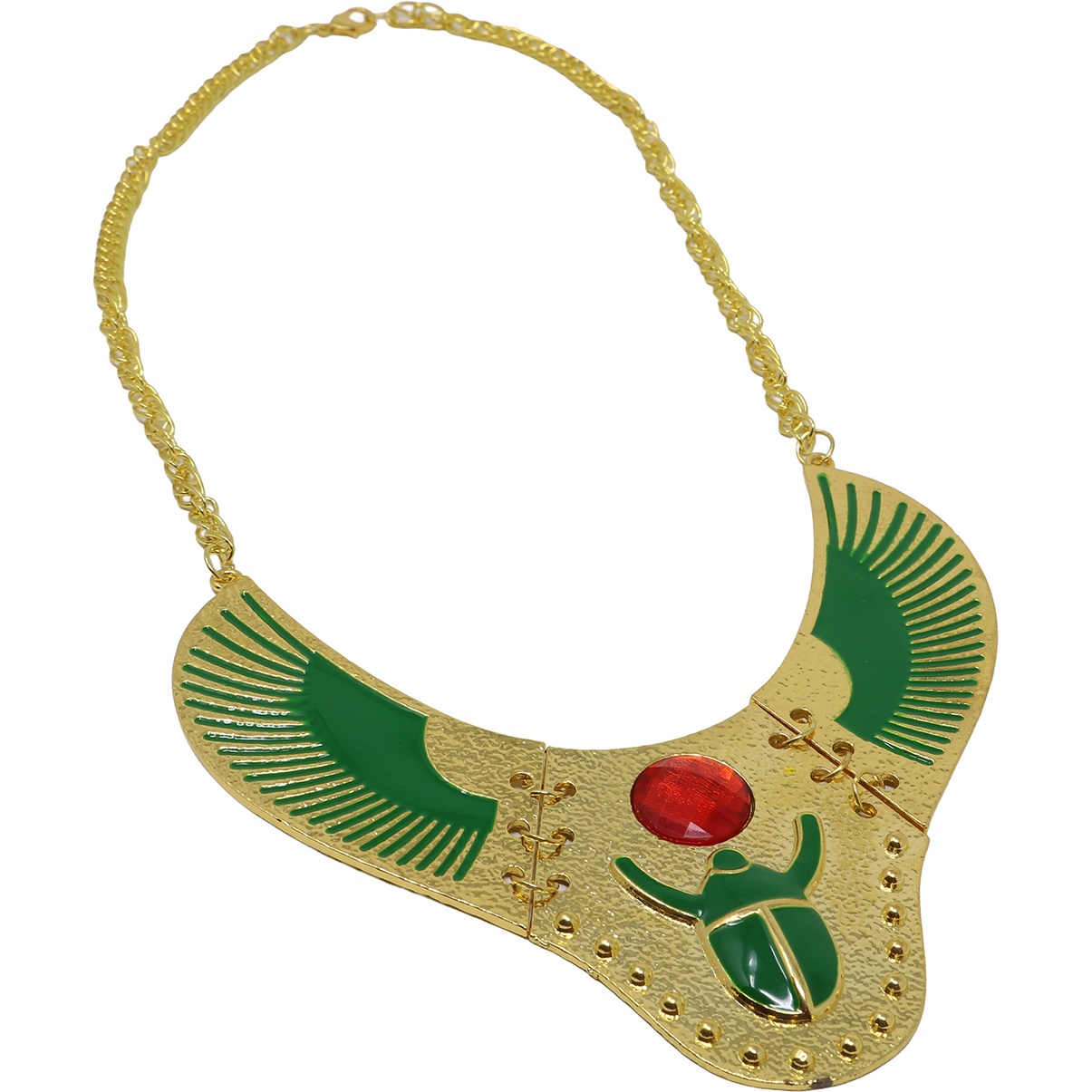 Collier de style égyptien inspiré par Cléopâtre. Son motif ailé, ses touches vertes et sa pierre centrale rouge apportent une note de couleur et d'élégance. Idéal pour parfaire votre tenue de reine égyptienne lors du Carnaval, de soirées à thème, de représentations théâtrales ou de séances photo, il crée un impact visuel immédiat et sublime tout costume inspiré de l'Égypte antique.