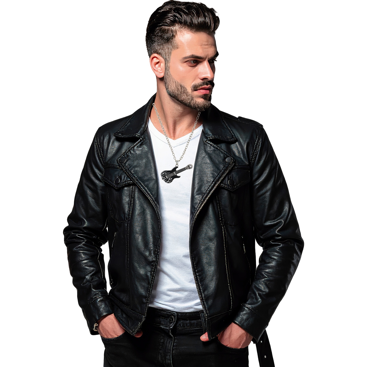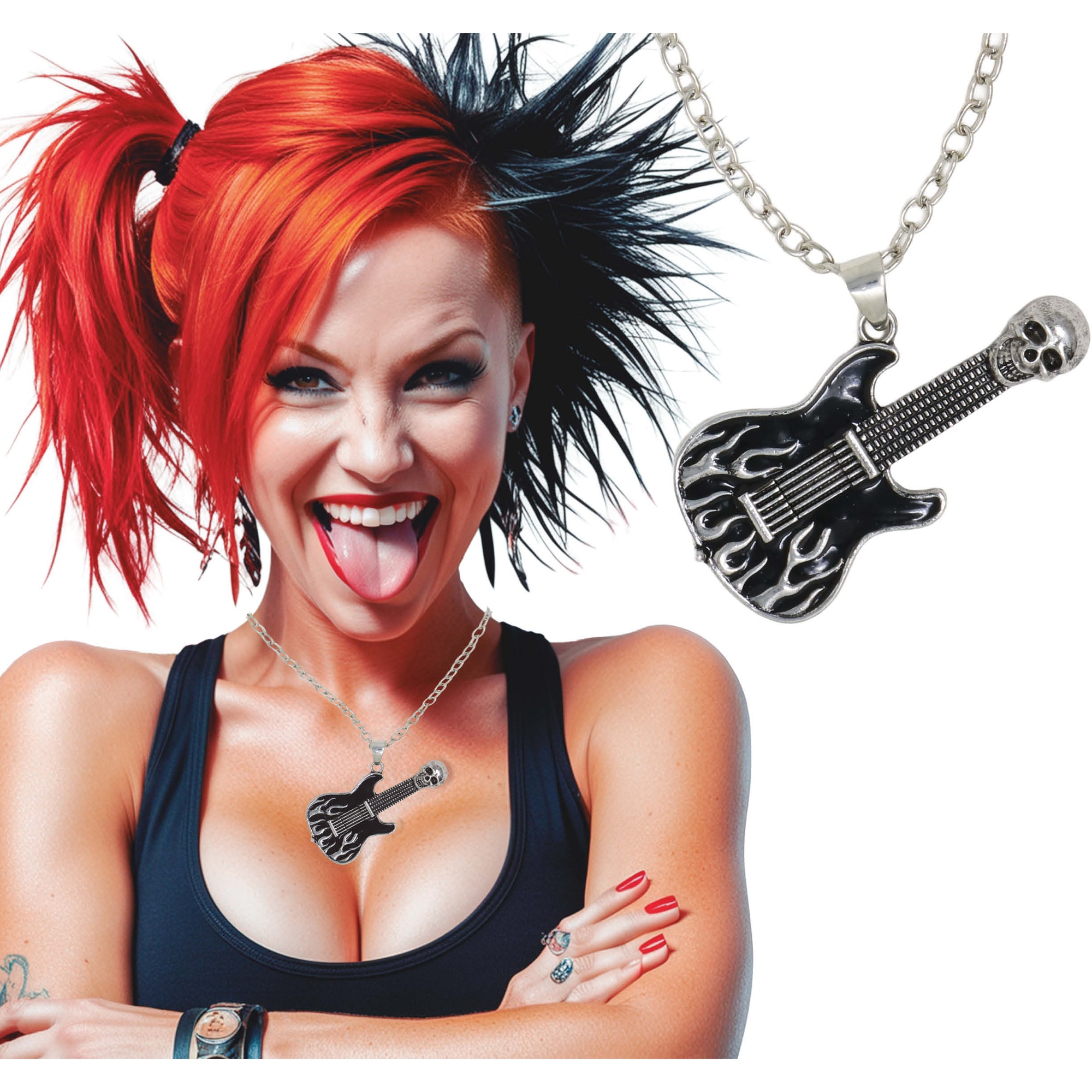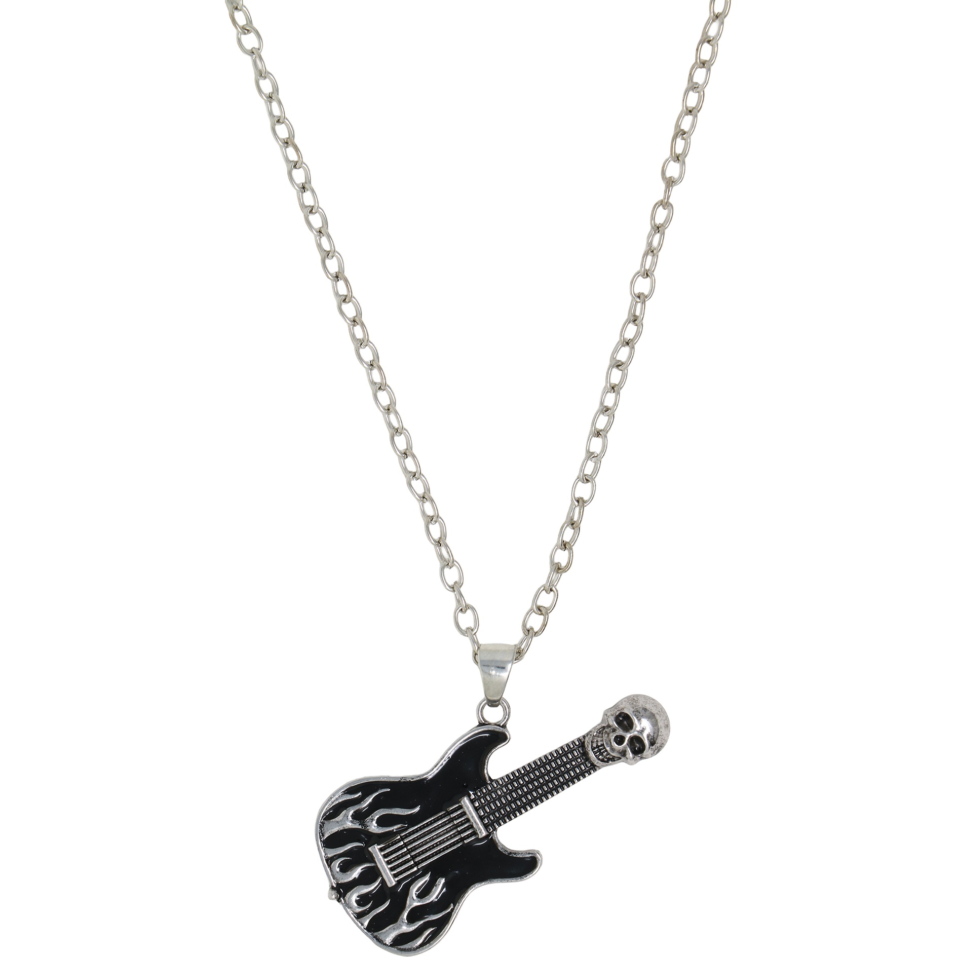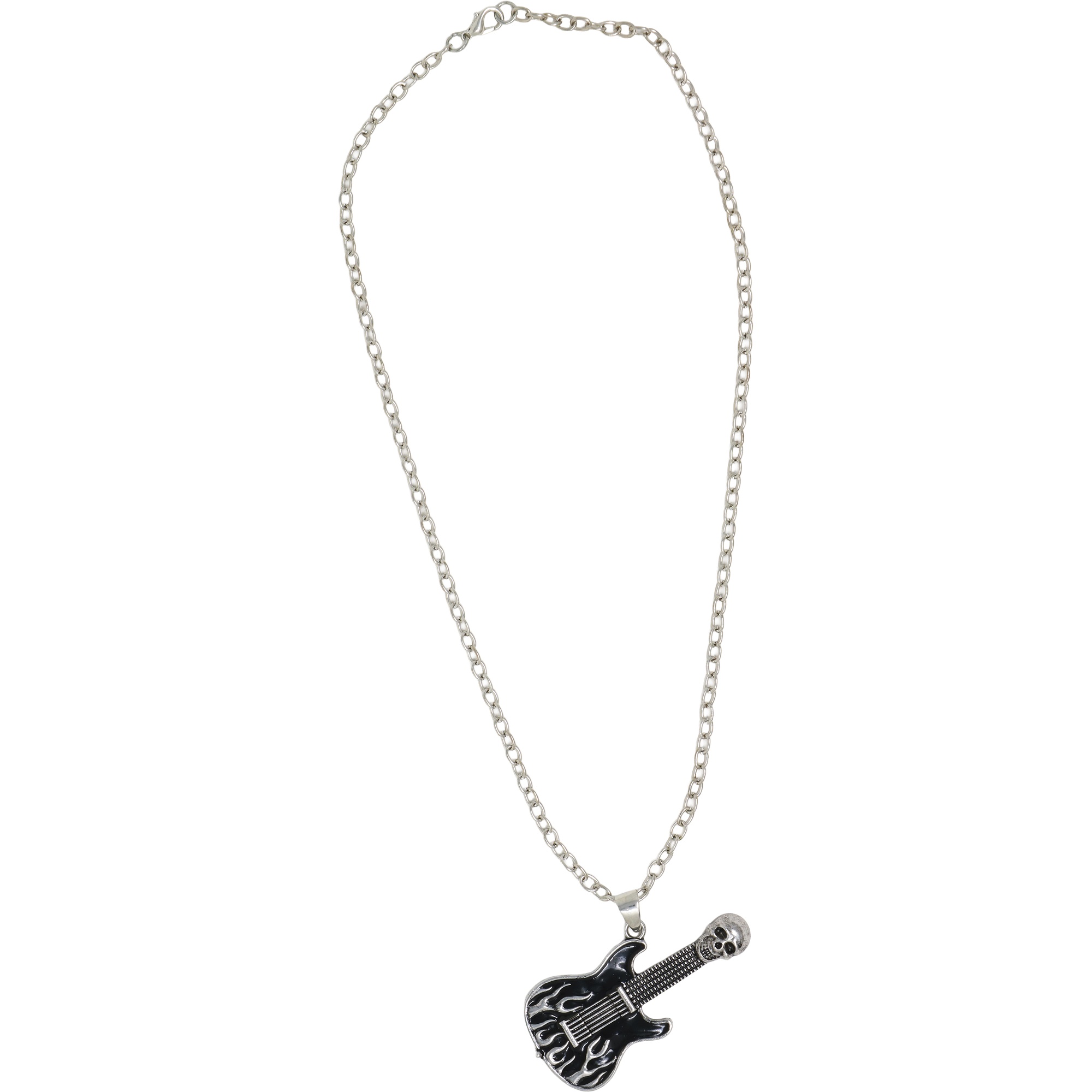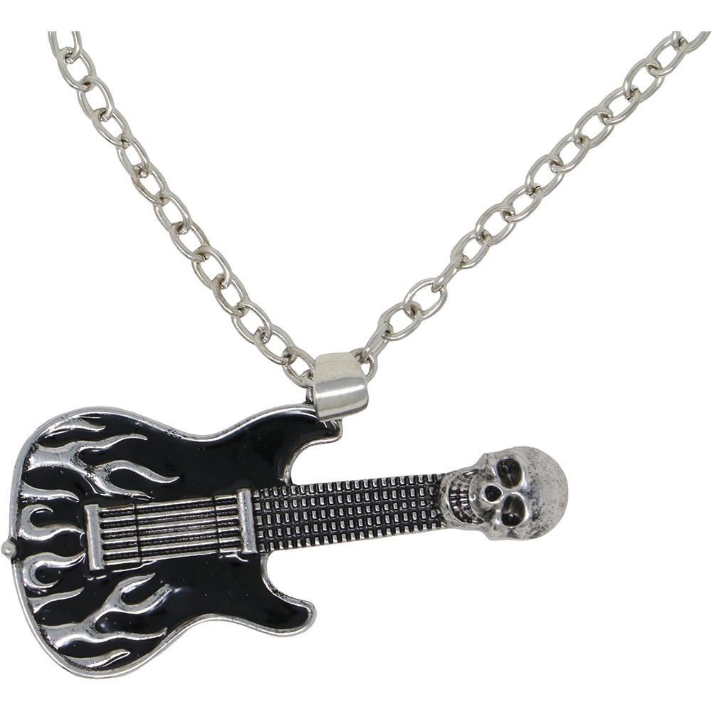Collier guitare électrique au design rock/punk: pendentif orné de flammes et d'une tête de mort sur la tête de manche pour un rendu rebelle et percutant. Fabriqué en métal avec finition argentée pour une esthétique affirmée, parfaitement adaptée au style alternatif. Idéal pour les concerts, les soirées à thème ou pour compléter votre tenue rock/punk au quotidien. Design unisexe pensé pour vous qui recherchez un accessoire plein de personnalité et connecté à la musique.