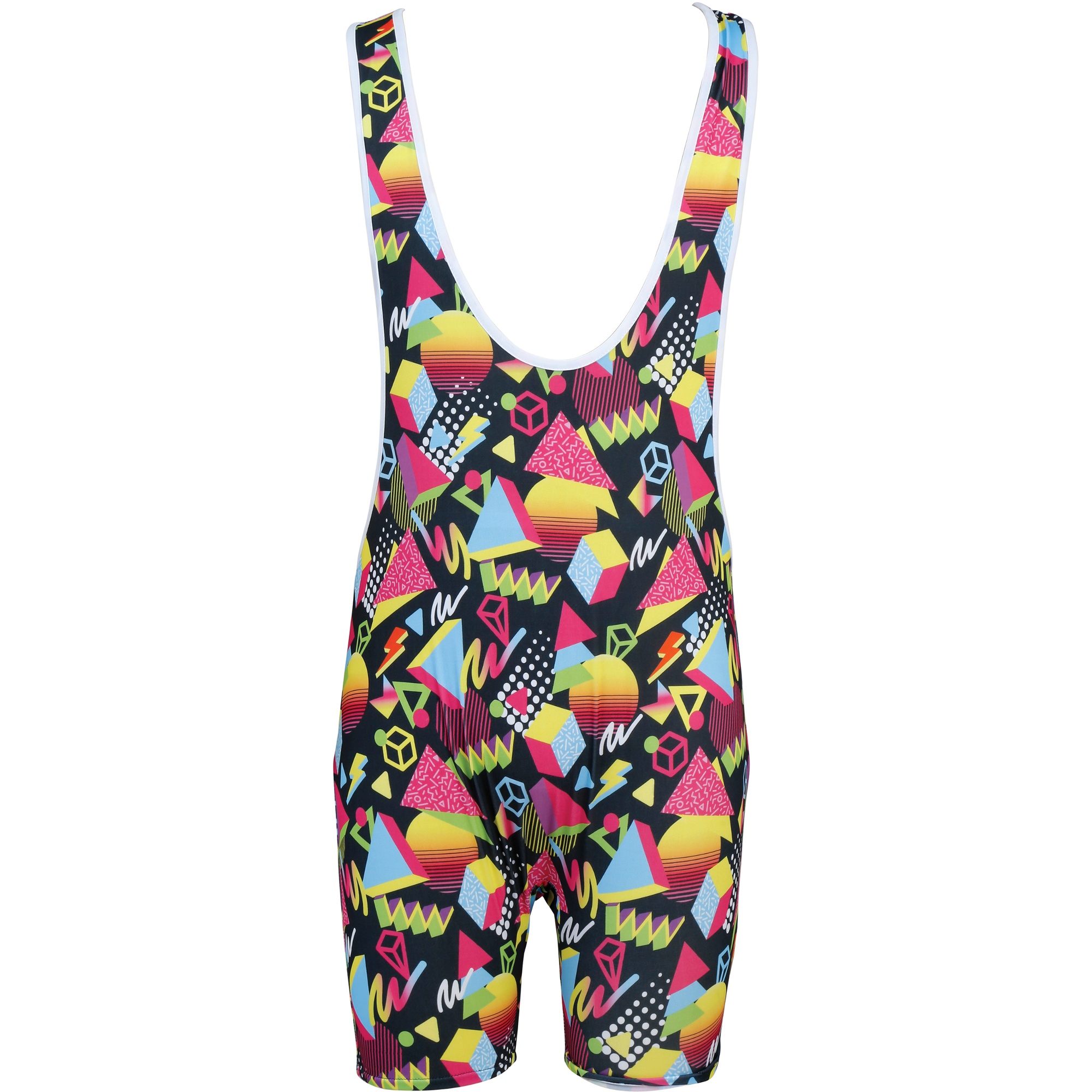 Combinaison néon 80s au style rétro. Motifs géométriques et couleurs néon qui recréent l'ambiance vibrante des années 80. Coupe ajustée avec larges bretelles et décolleté prononcé qui met en valeur la silhouette. Confectionnée en polyester extensible pour un maintien confortable et une totale liberté de mouvement. Parfaite pour vous distinguer lors de soirées à thème, séances photo et événements à l'esthétique rétro.