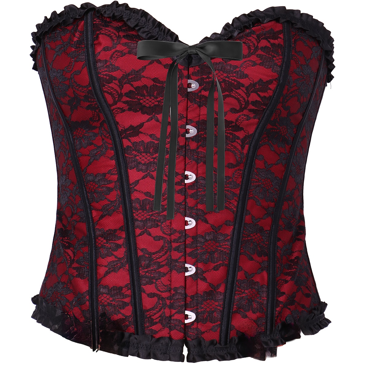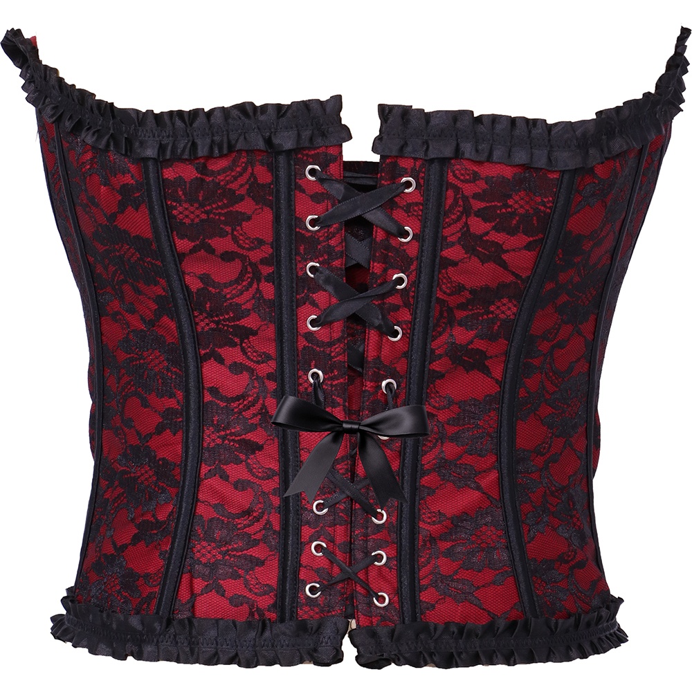 Corset bordeaux en dentelle au style burlesque affirmé, qui mettra en valeur votre silhouette et apportera une touche sophistiquée et audacieuse. Il présente une structure avec baleines apparentes et une fermeture devant de type busk pour un ajustement ferme et flatteur. Les volants et le petit noeud au décolleté ajoutent un charme rétro et féminin. Idéal pour compléter vos tenues de soirée, vos prestations ou pour devenir la pièce maîtresse de looks d'inspiration vintage.