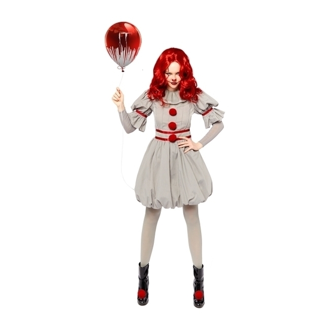 Ce déguisement effrayant de Pennywise pour femme, sous licence officielle, comprend une robe gris cendré avec des manches bouffantes, une jupe gonflée avec des détails rouges sang et une paire de bas gris assortis. Combinez-le avec une perruque rouge, du maquillage de clown et un ballon rouge pour effrayer tous vos amis !