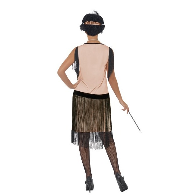 Déguisement complet inspiré des années 1920, composé d'une élégante robe couleur chair avec de longues franges noires sur la jupe et les épaules, d'un bandeau de plumes en guise de coiffure, d'un collier de perles blanches et du porte-cigarettes caractéristique. Le ruban et la partie supérieure de la robe sont ornés d'un magnifique motif géométrique noir. Elle est complétée par de belles broches sur la coiffe et à la taille.