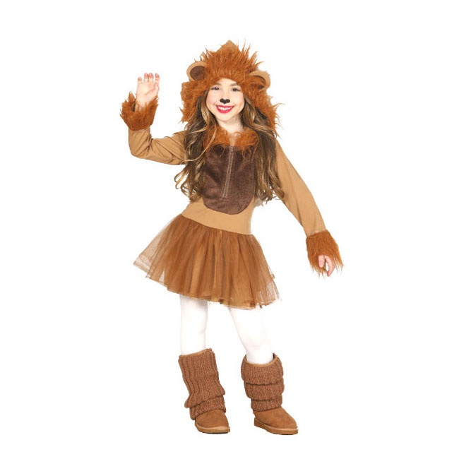 Déguisement de lionne pour fille. Il s'agit d'une robe à manches longues avec capuche et jupe en plusieurs couches de tulle. Autant sur les manches qu'autour de la capuche et du cou, il y a de la fourrure longue de couleur similaire à celle de la jupe. Devant, dans la partie centrale, elle présente un tissu doux au toucher de couleur marron plus foncé avec une fermeture éclair.