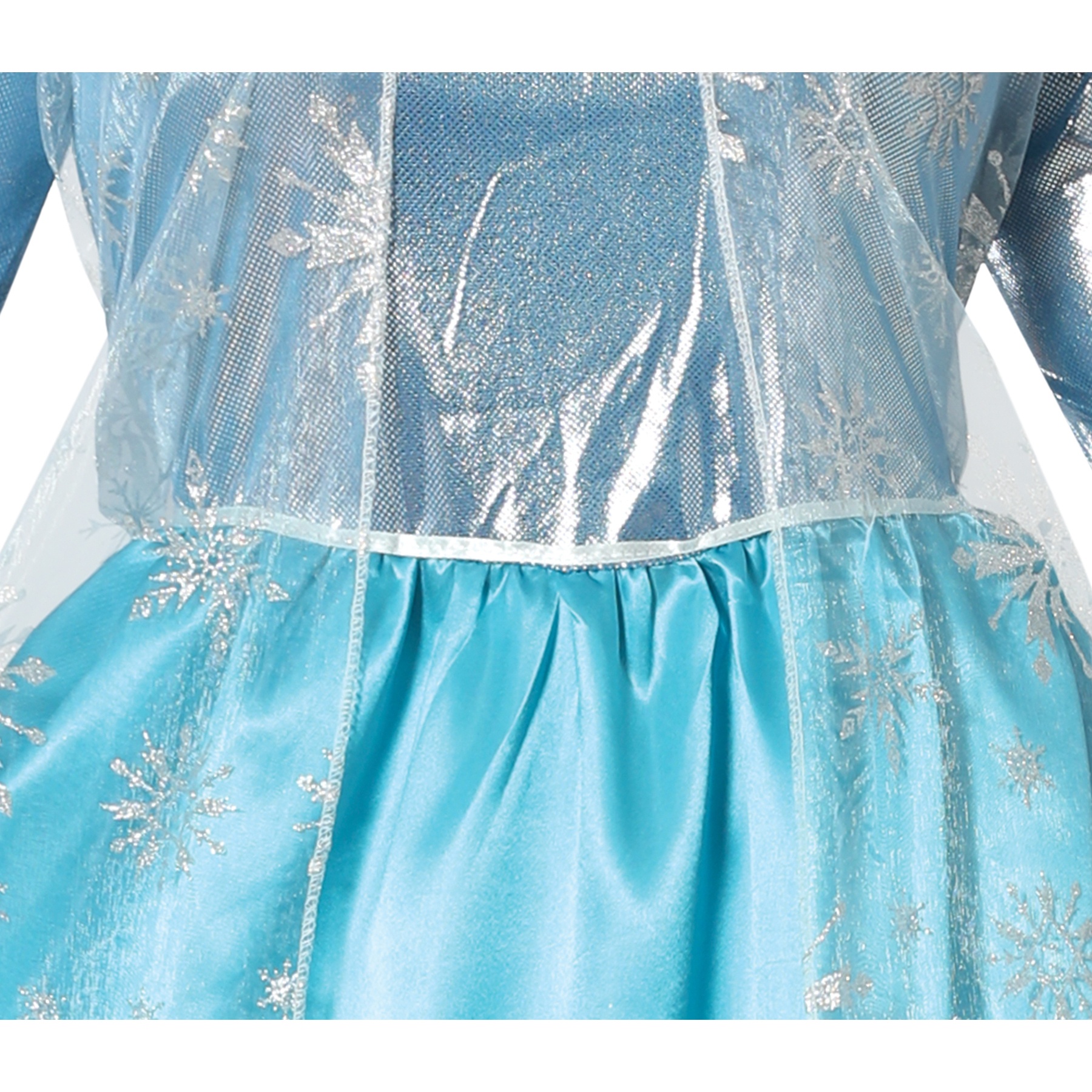 Ce déguisement saisissant se compose d'une robe à manches longues et jupe longue de deux tons de bleu, avec des lignes décoratives, une surtoile transparente, une taille élastique et des motifs de flocons de neige en blanc. Il est complété par un diadème en plastique avec un détail doré.