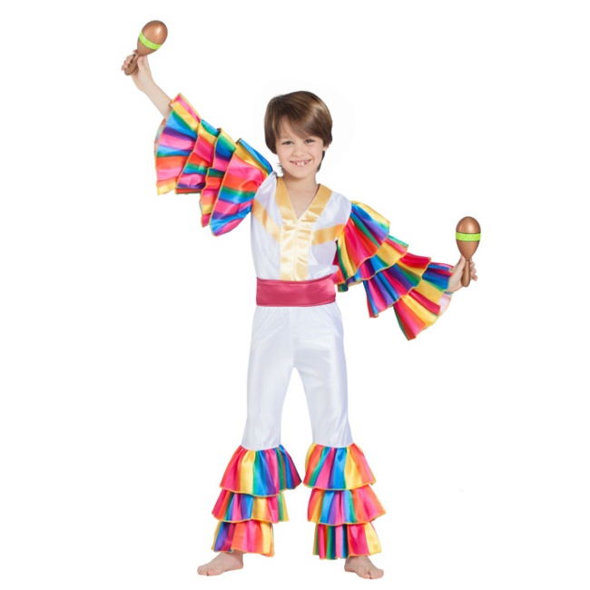 Il est composé d'un t-shirt blanc avec des bandes jaunes au centre et des manches à volants multicolores. Le pantalon suit le même schéma, il est de couleur blanche avec la touche accrocheuse des volants sur les jambes, et comporte un élastique à la taille pour un meilleur ajustement.