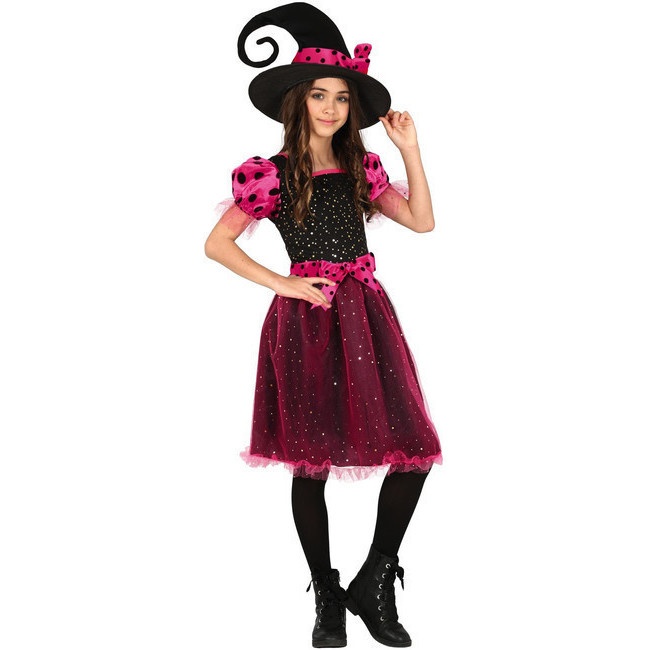 La partie de la jupe est faite de tulle avec un ourlet ondulé. Elle est complétée par un chapeau pointu noir entouré d'une étoffe colorée à pois, un détail trouvé également sur certaines parties de la robe.