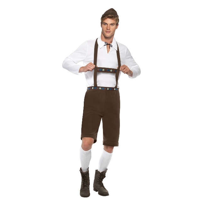 Transformez-vous en l'authentique Tyrolien allemand avec ce déguisement composé d'une chemise blanche à manches longues, d'un pantalon court avec des bretelles de couleur marron connus sous le nom de Lederhose, et d'un chapeau assorti.