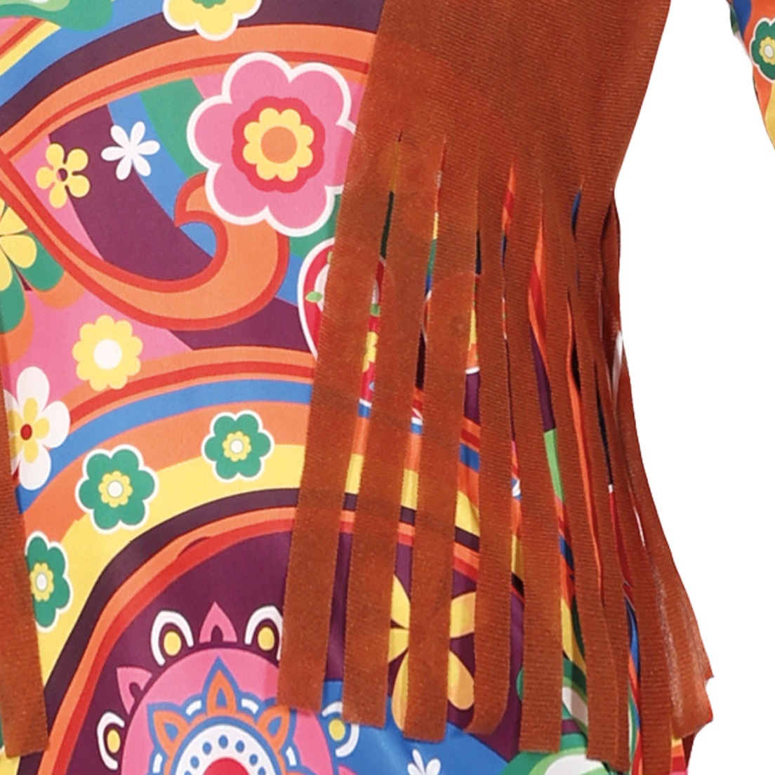 Coloré déguisement de femme hippie des années soixante-dix avec lequel vous triompherez lors des carnavals, anniversaires et fêtes à thème en général. Paix et amusement garantis!