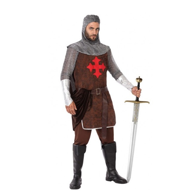Ce déguisement est composé d'un bonnet et d'un bavoir attaché au même, avec un style similaire à une cotte de mailles. Il est complété par une cape assortie et un t-shirt marron avec des manches en maille et un symbole de croix rouge sur la poitrine. Il est complété par un pantalon marron avec une taille élastique.