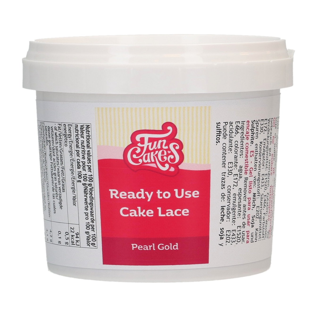 Le gel FunCakes Ready to Use Cake Lace, teinte Pearl Gold, offre un fini nacré et sophistiqué qui rehausse vos créations pâtissières d'une touche professionnelle.