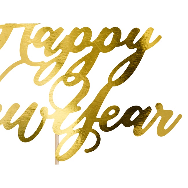Le design de ce topper se compose d'un bâtonnet en bois, orné à son extrémité d'une pancarte dorée avec le message 'Happy New Year' en couleur dorée avec effet métallisé.