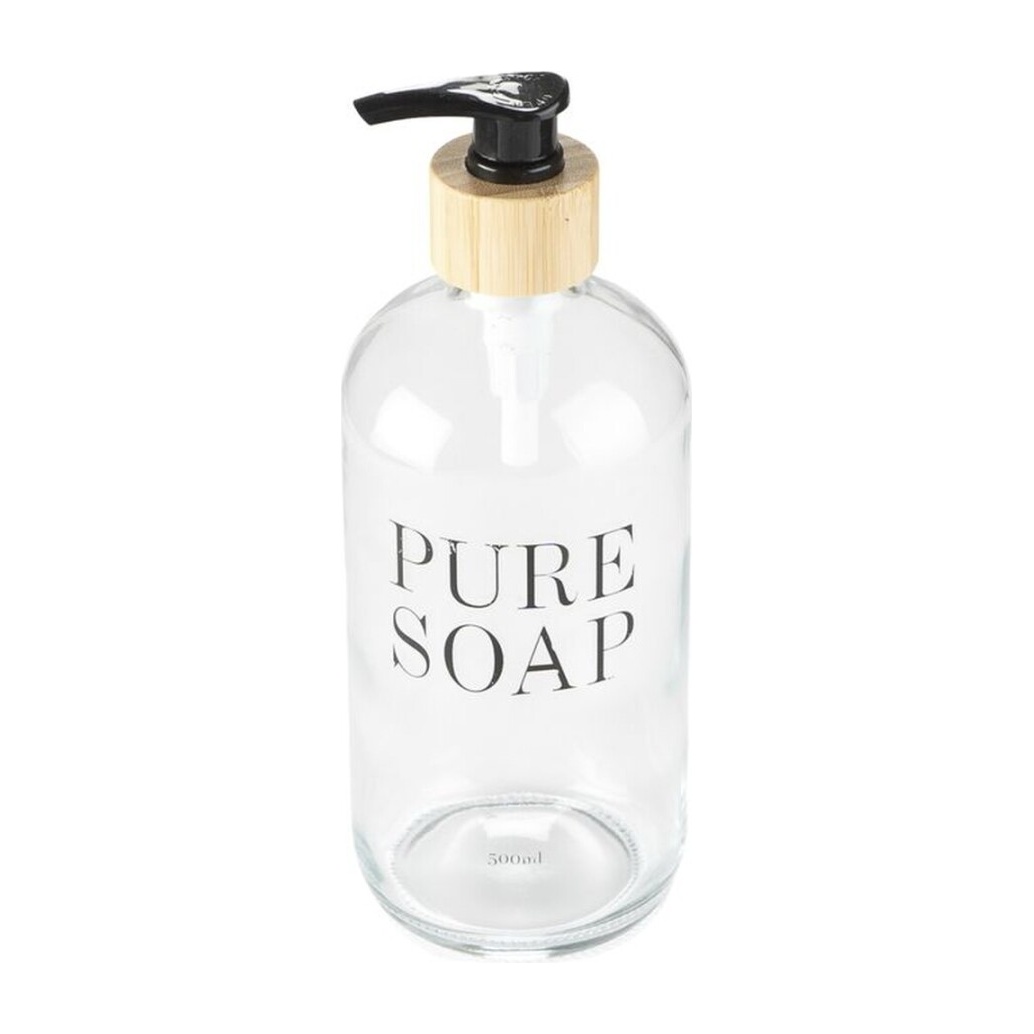 - Design élégant en verre transparent avec sérigraphie 'PURE SOAP'.