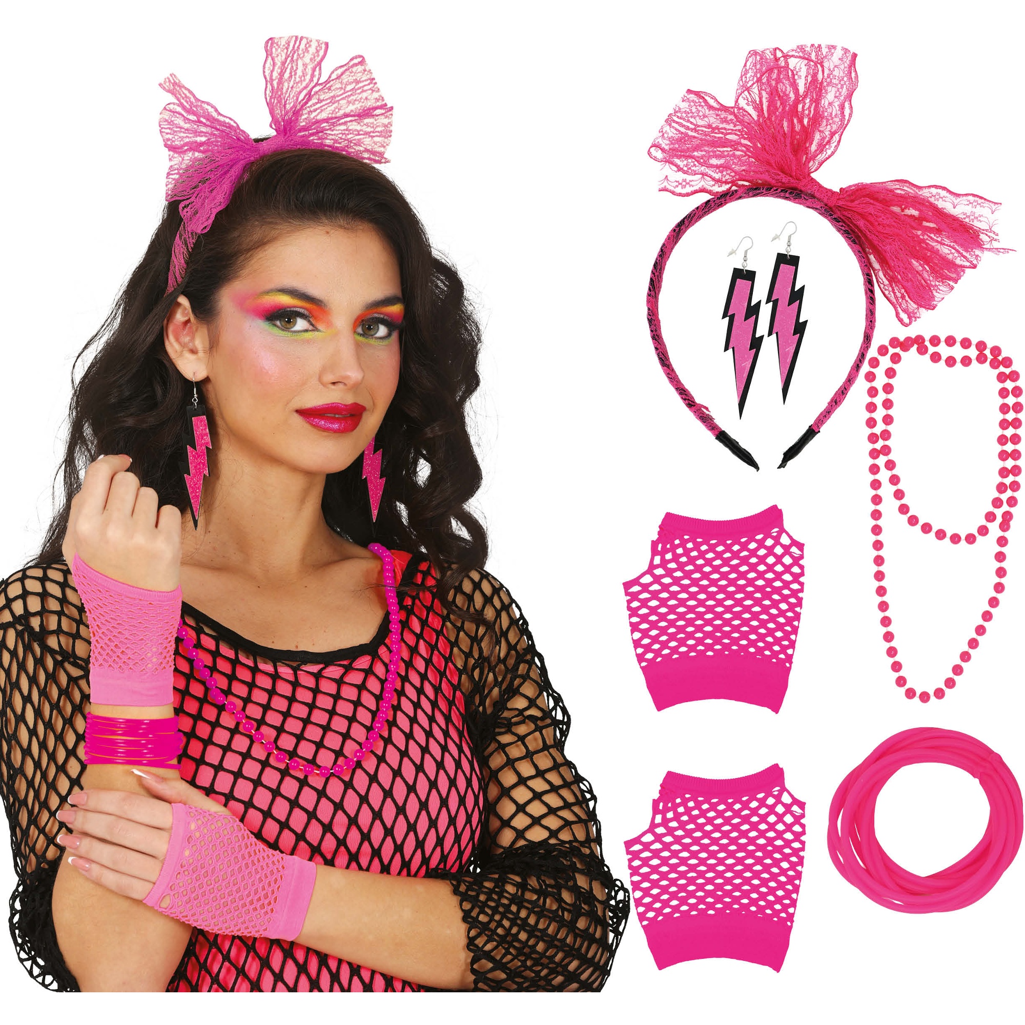 Faites sensation sur la piste avec un look rétro et haut en couleur grâce à cet ensemble d'accessoires inspiré des années 80. Les teintes néon et les formes audacieuses vous garantissent un style affirmé et immédiatement reconnaissable. Les pièces, légères et confortables, sont conçues pour que vous puissiez les porter toute la nuit sans renoncer à l'impact visuel. Idéal à associer à un maquillage années 80 et à des vêtements en résille ou à des couleurs intenses pour un rendu authentique.