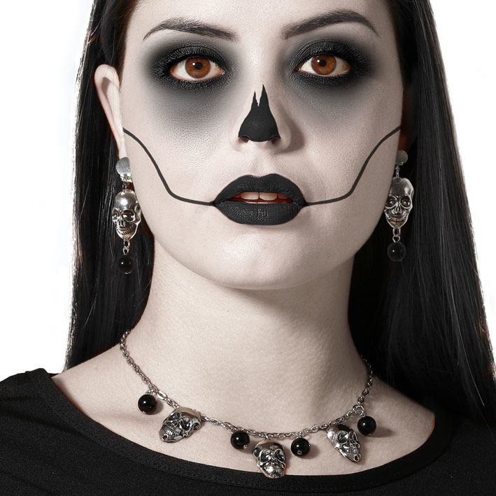 - Collier avec pendentif de crânes argentés et boucles d'oreilles assorties. Parfait pour des styles gothiques, sorcières ou mort élégante.