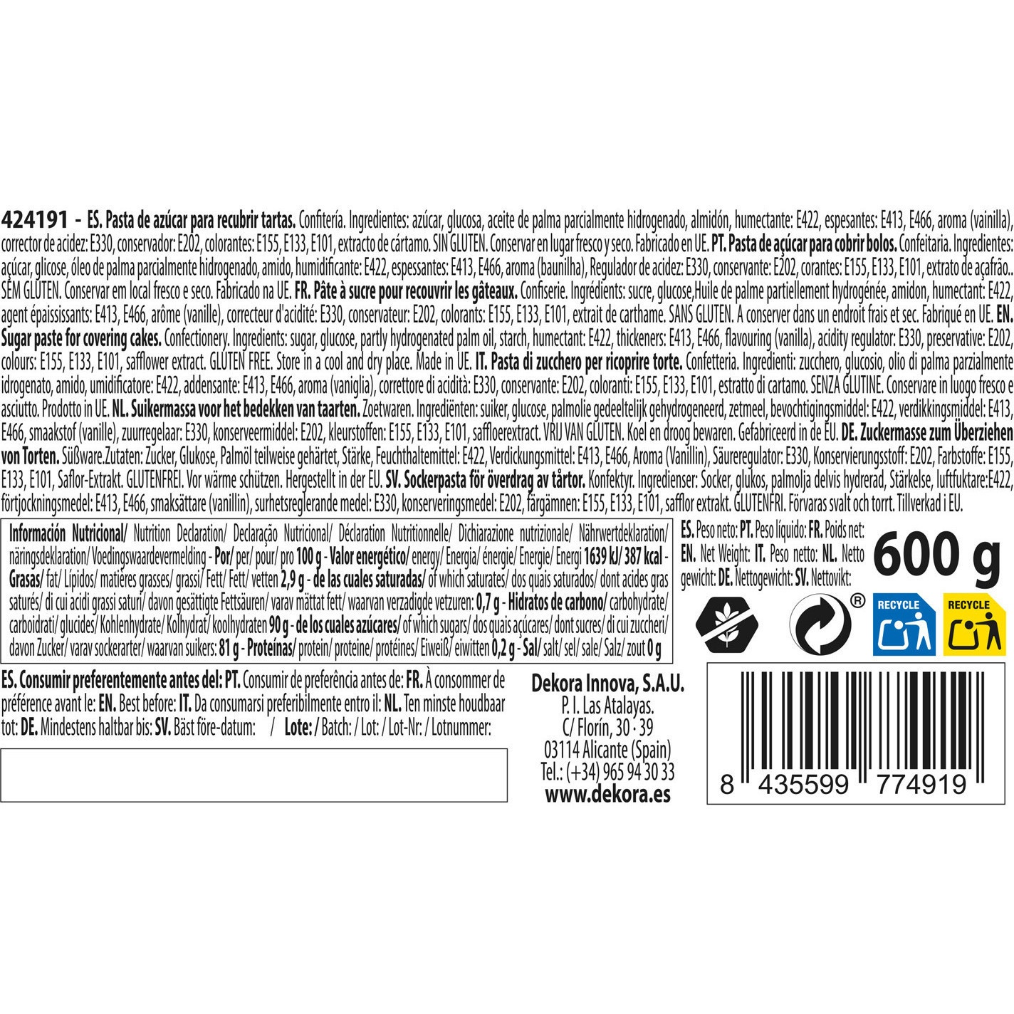 Ingrédients: Huile végétale partiellement hydrogénée, Amidon, Arôme (vanille), Sucre, Extrait de carthame, Glucose, Colorants: E101, E120, E133, E153, E155, Épaississants: E413, E466, Humectant: E422, Acidifiant: E330, Conservateurs: E202.
