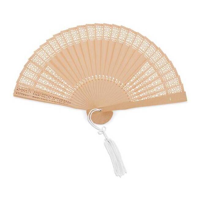 • Éventail à monture en bois naturel découpé avec pompon blanc