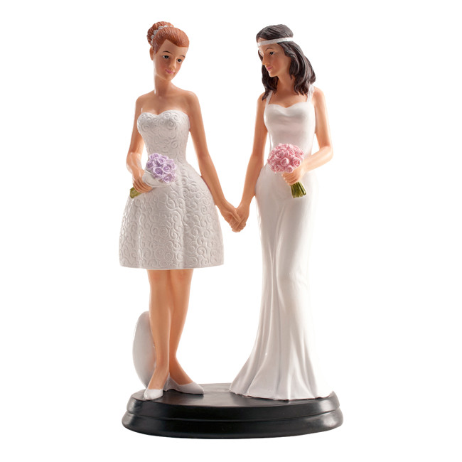 Cette décoration montre deux mariées se tenant par la main, chacune avec sa robe de mariée respective et tenant des bouquets de roses roses et lilas. Elles reposent sur un socle noir qui facilite son placement sur la surface du gâteau de mariage.